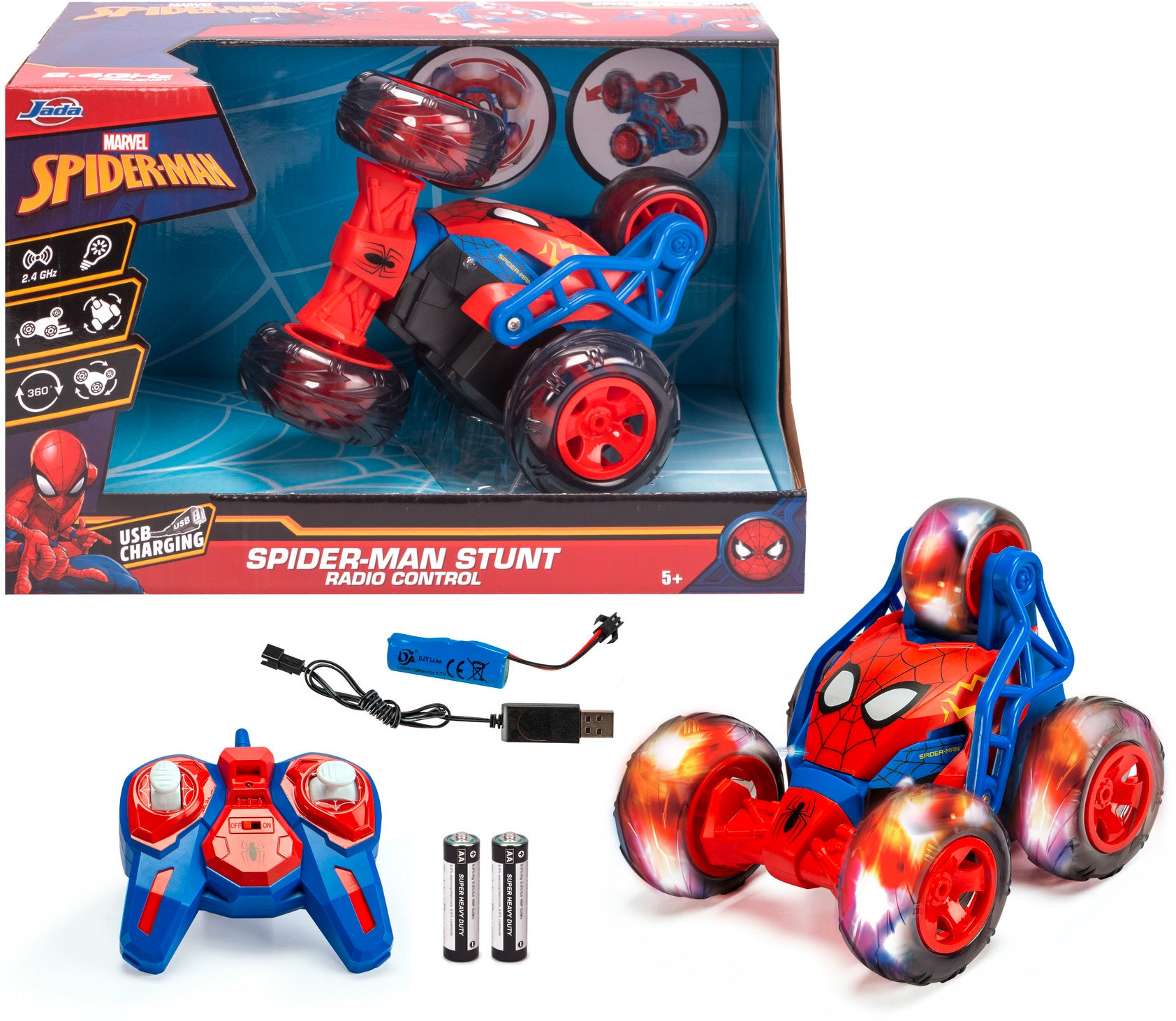 Marvel Spider-Man fjernstyret stuntbil fra Jada Toys med masser af spændende funktioner. Den har en turboknap for ekstra fart og 360° rotation til at udføre episke stunts med. Perfekt til fartfyldte eventyr. - Spider-Man-tema. - Styres med en fjernbetjening med 2-kanaler på 2,4 GHz. - Turbo boost-tilstand. - Laver stunts og 360-graders loops. - Oplades med USB-kabel (medfølger). - CE-mærket. - Anbefalet alder: Fra 5 år.