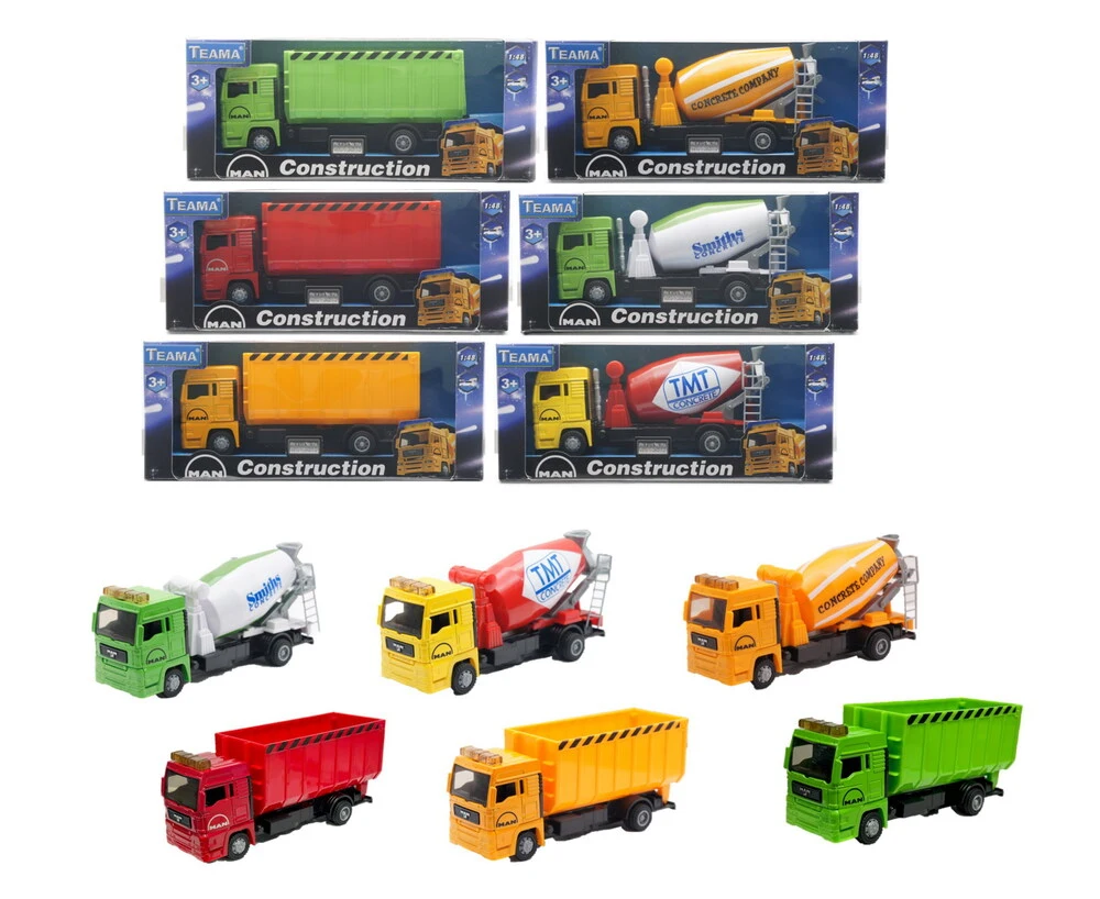 Teama lastbil sættet er det perfekte valg for børn, der elsker at lege med køretøjer. Dette sæt indeholder tre assorterede lastbiler og tre cementblandere, der kommer med en stige, hvilket giver uendelige muligheder for kreativ leg.