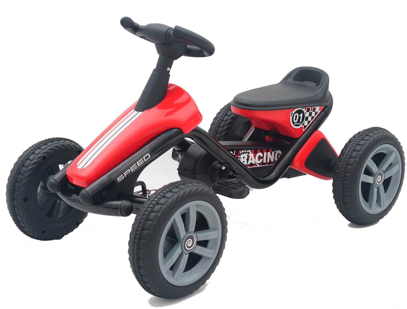 Virkelig flot pedal GoKart. GoKarten har EVA Gummidæk. Prisen kan kun holdes så lav pga. direkte import! Specifikationer EVA Gummidæk Stærk konstruktion Sportsrat Lukket Kædeskærm Frem/tilbage Anbefalet alder: 3-6 år Max vægt: 25 kg Størrelse: 83 x 48 x 4