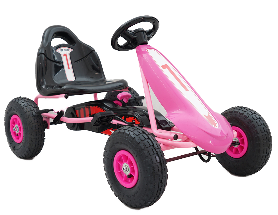 Virkelig flot pedal GoKart. GoKarten har rigtige dæk med luft. Prisen kan kun holdes så lav pga. direkte import! Specifikationer Rigtige dæk med luft Stærk konstruktion Sportsrat Hånd bremse Lukket Kædeskærm Frem/tilbage Anbefalet alder: 3 - 7 år Max væg