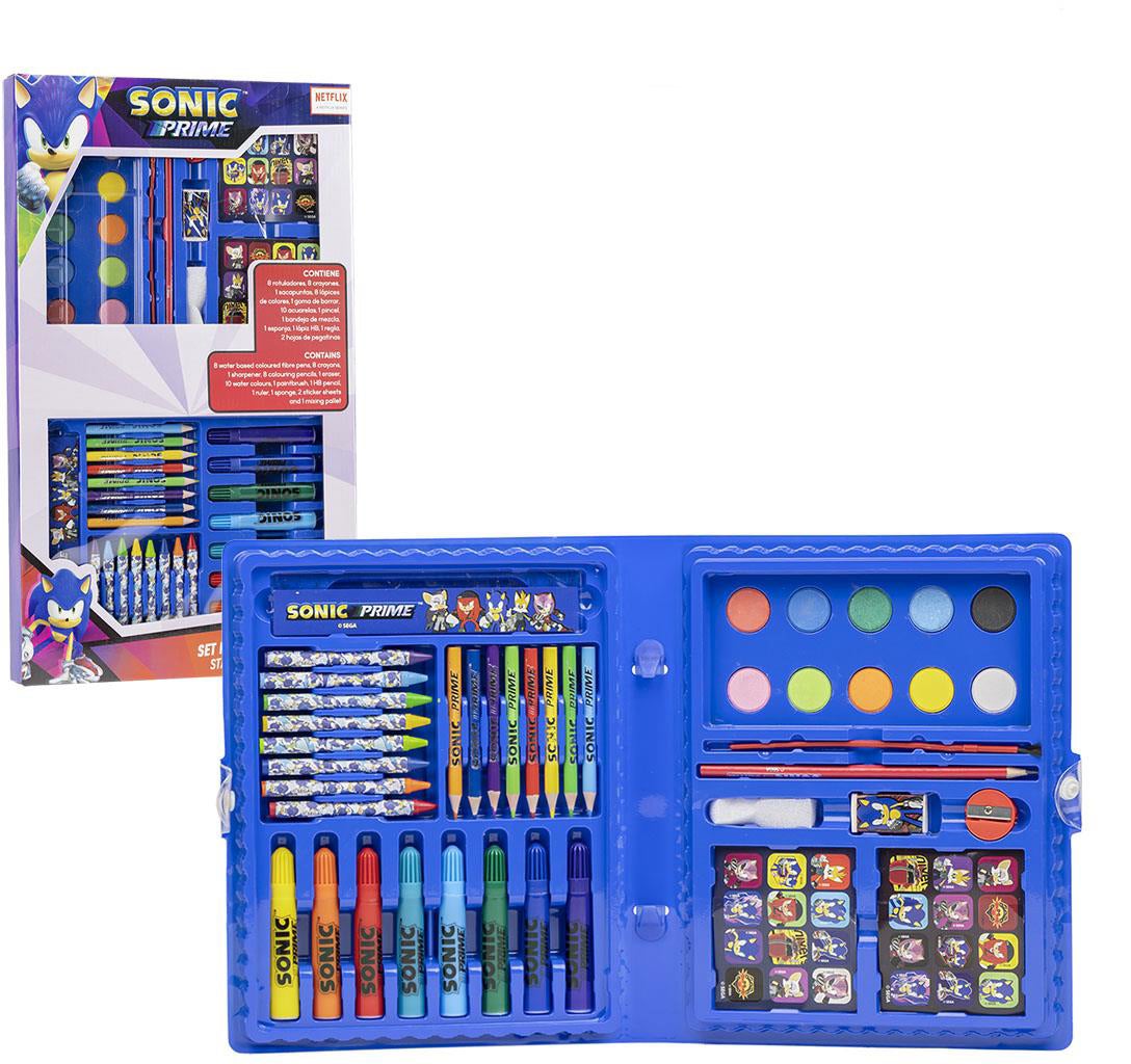 Malesæt fra Sonic med en masse spændende maletilbehør med et sejt tema. Perfekt til kreative aktiviteter. - Indeholder: 8 filttusser, 8 farvekridt, 8 farveblyanter, 2 blyanter, 1 viskelæder, 1 blyantspidser, 1 lineal, 2 klistermærkeark, 12 vandfarver, 1 pensel. - Let at opbevare. - Flot design. - Perfekt at tage med på udflugter og ture til dit barn. - CE-mærket. - Anbefalet alder: Fra 2 år. - Plastik.