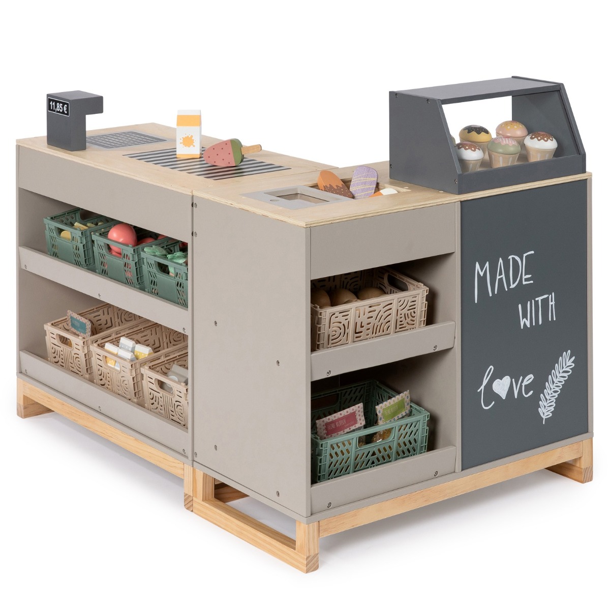 Købmandsbutikken Bollea i grå er det ideelle legetøj til børn, der elsker at lege butik og simulere hverdagens situationer. Denne smukt designede købmandsbutik kombinerer funktionalitet med æstetik og vil med sikkerhed fange dit barns fantasi. Med sine bløde, moderne linjer og den stilfulde grå farve passer Købmandsbutikken perfekt ind i ethvert hjem. Den er designet til at være både holdbar og attraktiv, hvilket gør den til en fantastisk investering i dit barns leg. Butikken er udstyret med hylder til at opbevare varer, en kasseapparat og meget mere, så dit barn kan skabe sin egen sjove indkøbsoplevelse. Købmandsbutikken fremmer kreativ leg og social interaktion, når børnene spiller sammen. Den opmuntrer til rolleleg og giver børnene mulighed for at udvikle deres kommunikationsevner og fantasi. Det er ikke bare et legetøj; det er en læringsoplevelse, der hjælper med at udvikle vigtige færdigheder, mens de har det sjovt. Uanset om det er til fødselsdagsgaver, julegaver eller bare for at forkæle dit barn, er Købmandsbutikken Bollea i grå det perfekte valg. Giv dit barn muligheden for at udforske og skabe sin egen verden med dette fantastiske legetøj.