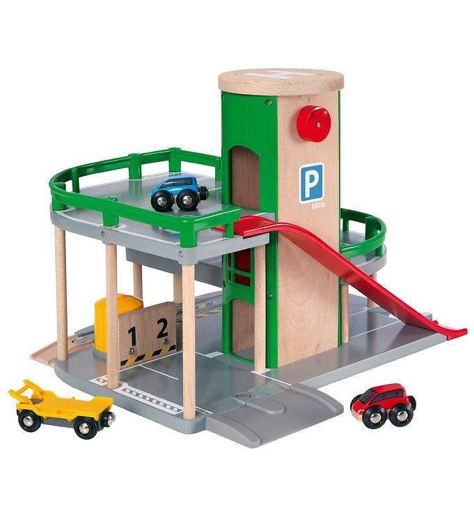 Med BRIO World Parkeringshus 33204 kan børnene skabe deres egen lille verden. Brug elevatoren til at transportere bilerne mellem etagerne, eller lad dem suse ned ad rampen. De mange interaktive elementer sikrer, at børnene aldrig løber tør for nye måder at lege på.
