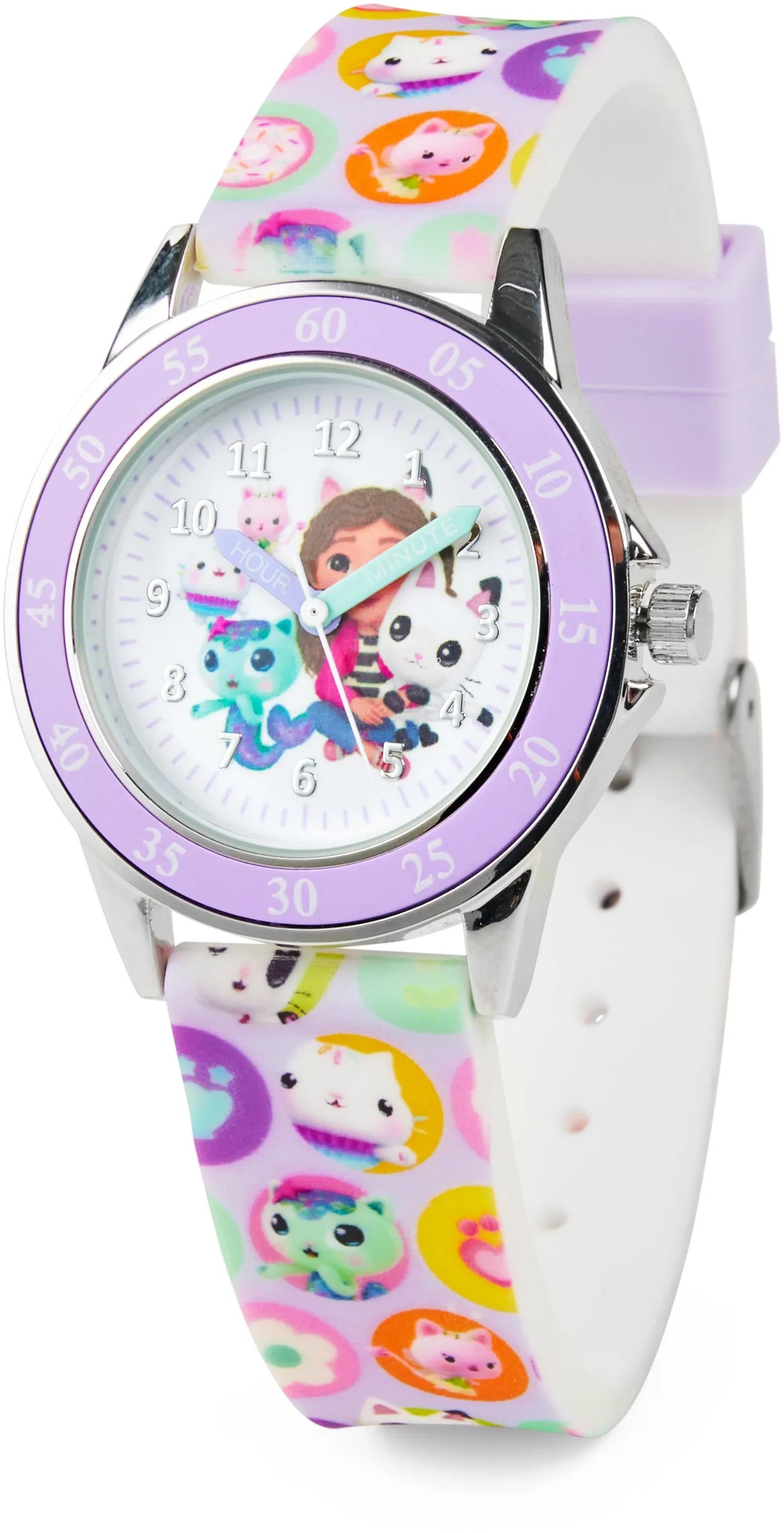 Time Teacher ur fra Gabby's Dollhouse med visere, der er lette at forstå. Perfekt til sjov indlæring. - Urskive af plexiglas. - Silikonerem. - Vandafvisende. - Kvartsur. - CE-mærket. - Rustfrit stål, silikone. - Batterier medfølger.