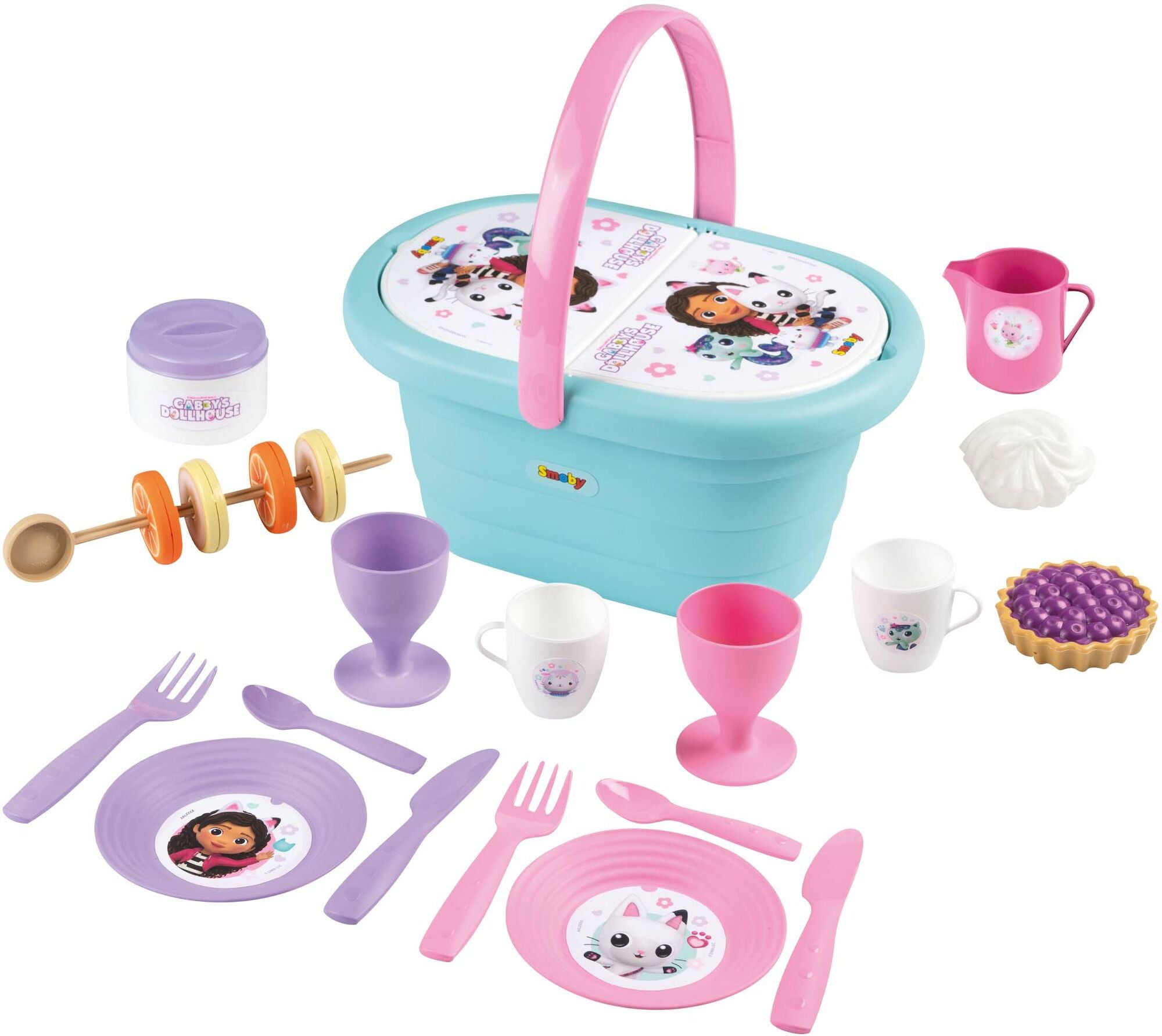 Picnicsæt fra Smoby med et indbydende Gabbys Dukkehus-tema. Perfekt til sommerdage fyldt med leg. - Indeholder: 1 picnickurv, 2 kopper, 2 fremstillet af glas, 2 tallerkener, 6 bestik, 1 mælkekande, 1 sukkerskål, 4 frugtskiver, 1 grillspyd, 1 lagkage. - Antal dele: 21. - Farverigt design. - Let at tage med på farten. - Perfekt til barnets fantasifulde lege! - CE-mærket. - Anbefalet alder: Fra 3 år.