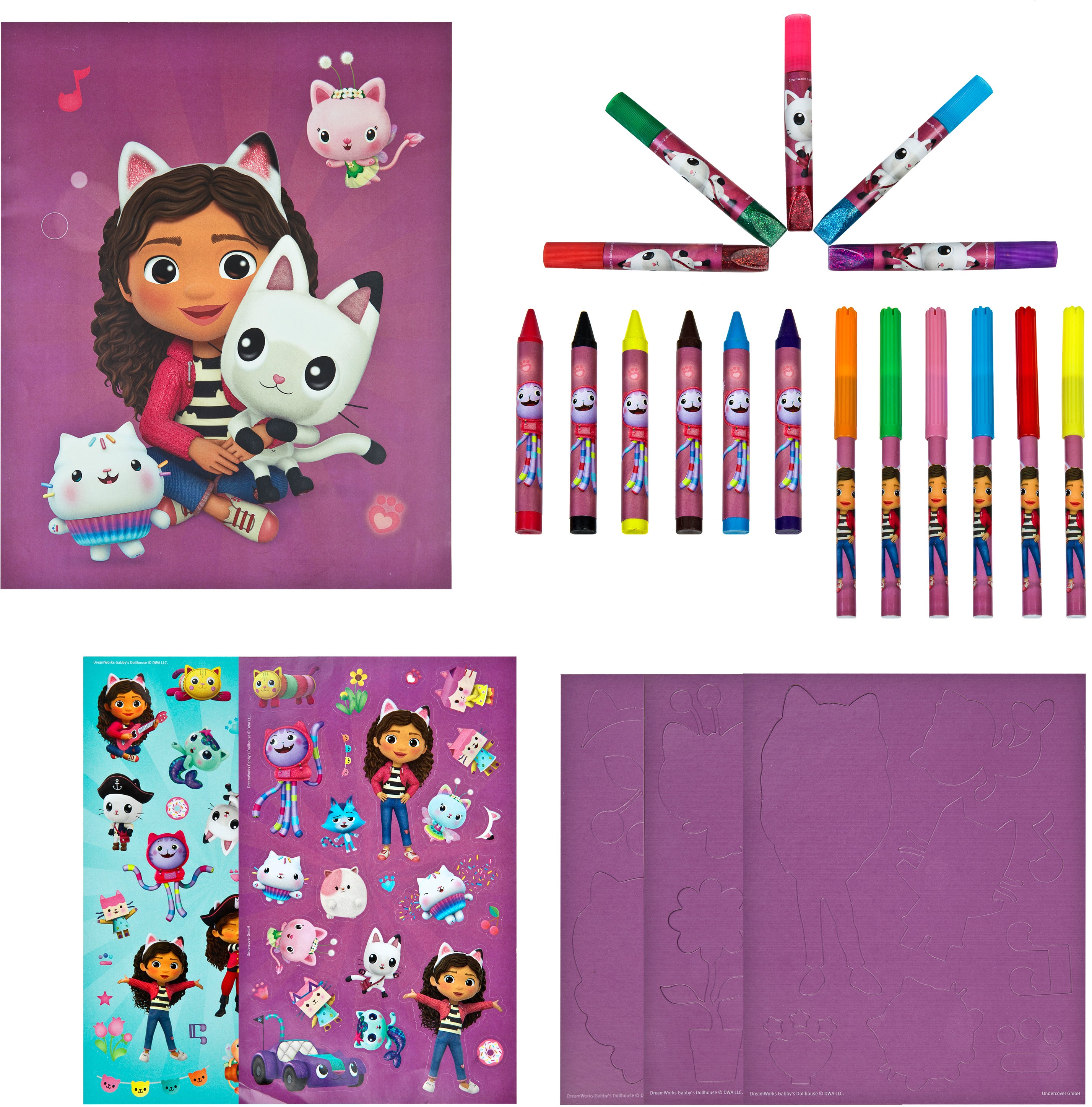 Gabby's Dollhouse kreasæt fra UnderCover med en masse sjovt tilbehør, som kan kombineres på mange kreative måder. Perfekt til mange timers kreativ leg og kunsthåndværk. - Indeholder: 1 malebog, 2 klistermærkeark, 3 stenciler, 6 farvekridt, 5 glitterlime, 6 tusser. - Inspirerer til kreativitet og en personlig stil. - Udvikler kognitive og finmotoriske færdigheder. - CE-mærket. - Anbefalet alder: Fra 3 år.