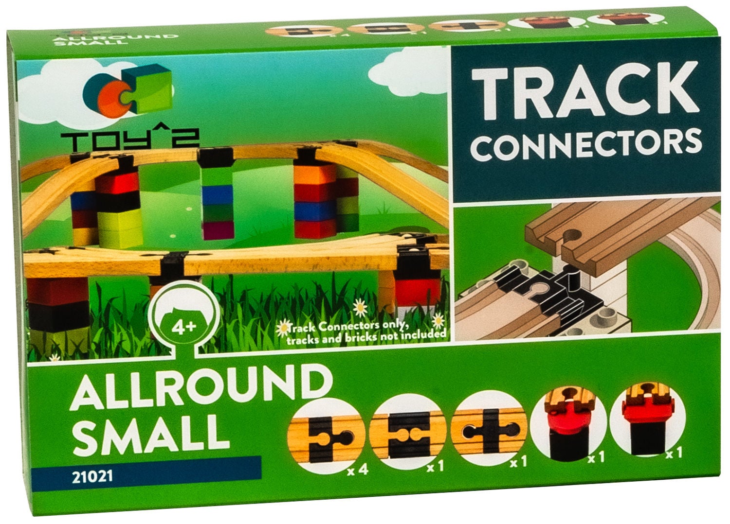 Indeholder 8 TOY2 Track-Connectors. Med Alround Small kan du bygge i to niveauer og let komme over dørtærskler og andre forhindringer. Perfekt til at komme i gang med store byggeprojekter. Forbinder DUPLO®, BioBUDDi og modsvarende med trætogskinner fra BRIO®, Thomas Tog, Ikea m.fl. OBS: Byggeklodser og træskinner medfølger ikke.