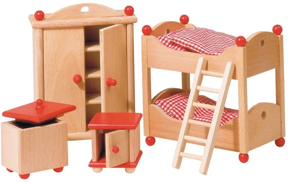 Når dit barn har fået sig et dukkehus, så skal der selvfølgelig også nogle møbler i, for at udvikle legene. I dette sæt er der møbler til at indrette et børneværelse.Sættet er enkelt og består af en køjeseng, et klædeskab, et lille skab og en opbevaringskasse. Der er dyne og pude til sengene.De få dele gør det overskueligt for dit barn, og giver samtidig plads til, at det selv kan finde flere ting til at indrette med. Det kan for eksempel være at tegne små tegninger, som kan bruges som billeder på væggen. Det kan også være at væve et lille tæppe, som kan ligge på gulvet.Møblerne passer til dukker på 10-14 cm.Fremstillet af træ og stof.Kan rengøres med en fugtig klud eller med sprit.