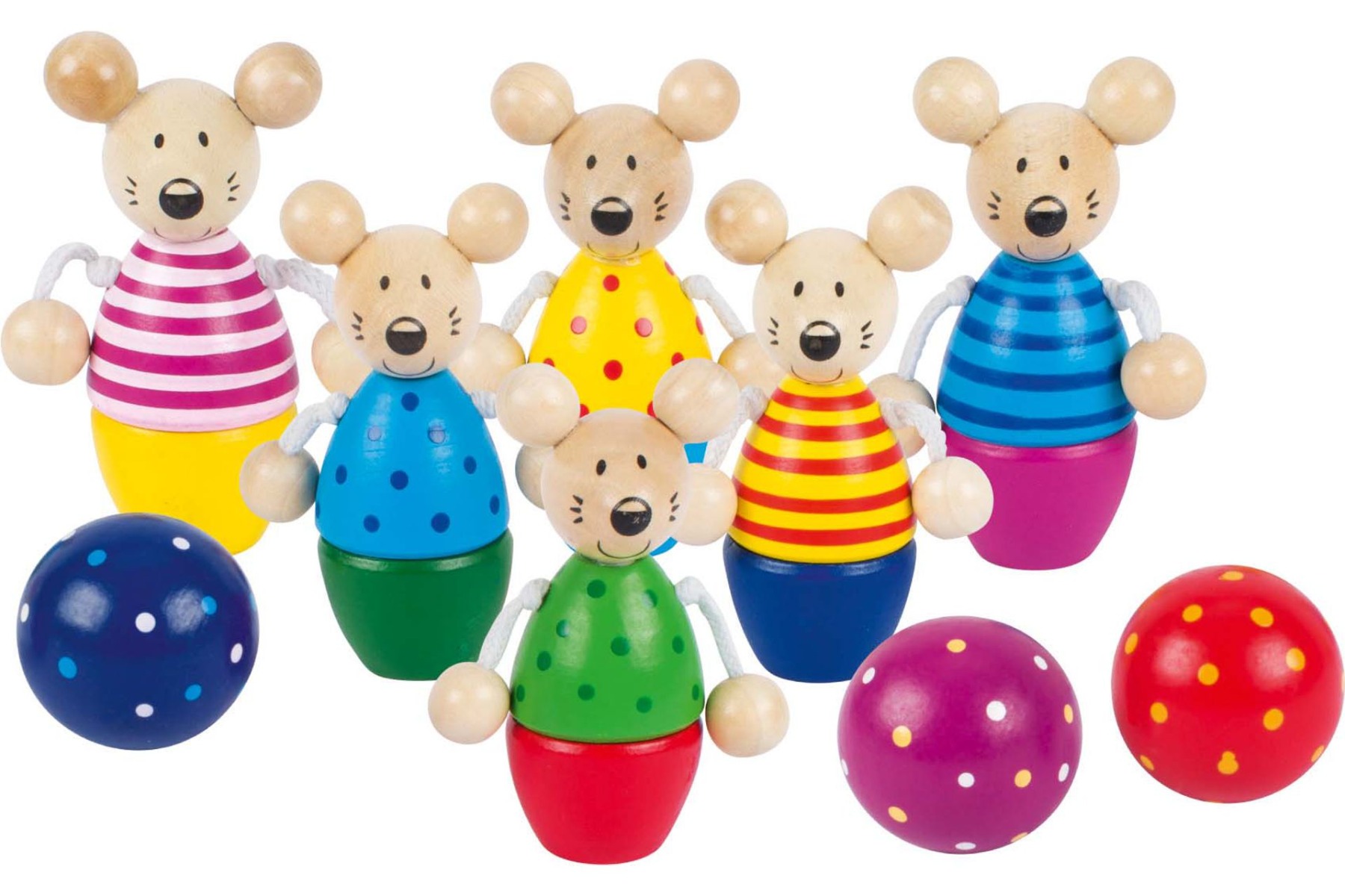 6 små, frække mus med kække smil i skønne farver og 3 trækugler, som I skal prøve at vælte musene omkuld med.Fint mini-bowling eller boule-spil, som udvikler hånd-øjekoordinationen og gør det muligt for de helt små at være med til at spille bowling.Måler 3,5 x 9 cm.Dansk produceret.