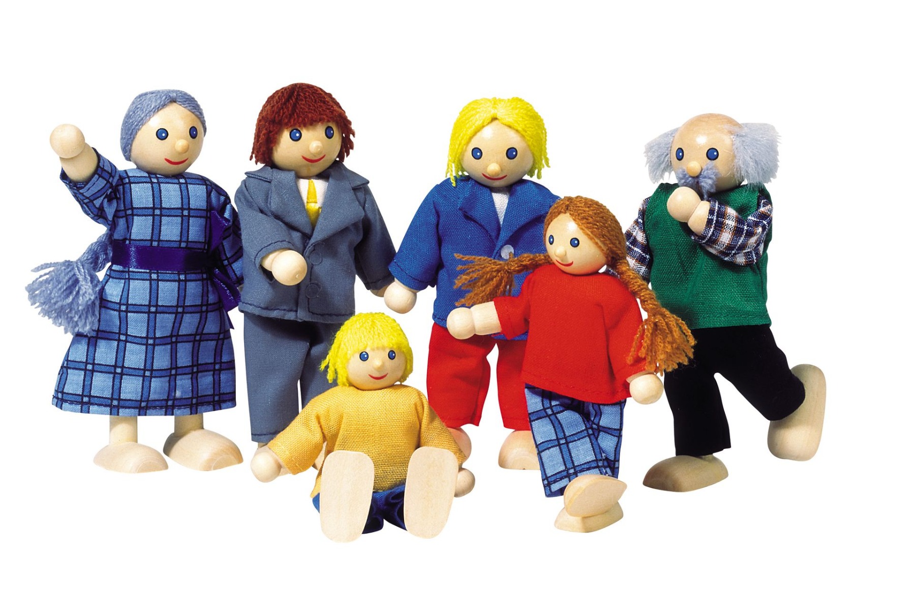 Dukkefamilie bestående af far, mor, storesøster og lillebror samt et par bedsteforældre. Perfekt til at lege Mor, far og børn-lege. Med et dukkehus og en dukkefamilie kan dit barn lege hverdagssituationer. Her er det sjovt at se, om du kan se dig selv i en af rollerne. Måske siger den ene dukke ofte Shhhhhhh, mens en anden uddeler påtalende mange ordre. Bedstemoren bager mange kager, og bedstefaren har altid et hemmeligt sted med slik eller andre finurlige ting, som giver stof til eftertanke. Uanset, så er det en god måde for dit barn i at øve sig på sociale færdigheder og på rolleleg.Dukkerne måler 12-10 cm og er fremstillet af stof og træ.