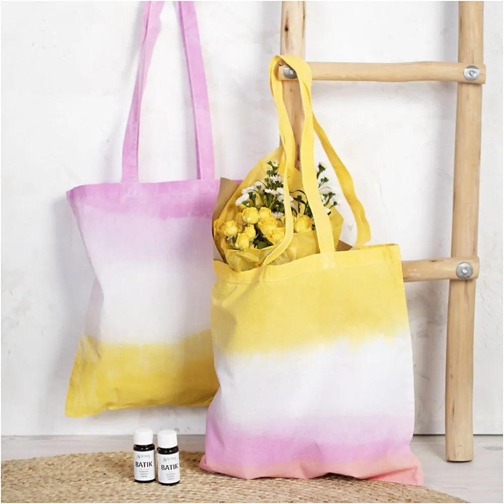 Her får du muleposer, grydelapper og viskestykker og batikfarve at farve dem med.Batikfarvning er en gammel klassiker og med sættet her kan du vække teknikken til live hjemme hos dig og skabe flotte effekter og mønstre med batikfarve, fikseringsmiddel (så farven ikke vaskes ud igen) og almindeligt køkkensalt. Indhold:Batikfarver i grøn, gul og rødFikseringsmiddelMuleposer, viskestykker og grydelapperBomuldssnor.Fint køkkensalt skal du selv have. Prøv fx teknikken bullseye ved at tage fat i en del af stoffet nogenlunde i midten og vikle den stramt med bomuldssnoren. Eller lav dip dye ved at lave baljer med forskellige farver, som du så dypper dele af tekstilet i.Batikfarven smitter af, så dæk gerne af med voksdug og brug handsker, når du arbejder med batikfarvning.Sådan gør duDæk af med plast/voksdug og brug handsker.Hæld køkkensalt i kogende vand og lad det opløses. Du skal bruge ca. et halvt kg fint køkkensalt til 1 liter vand.Hæld herefter mere vand i for at sænke temperaturen.Jo lavere temperatur vandet har, jo lysere bliver farven.Tilsæt batikfarven og fikseringsmidlet.Brug resultatet hjemme eller som gave.