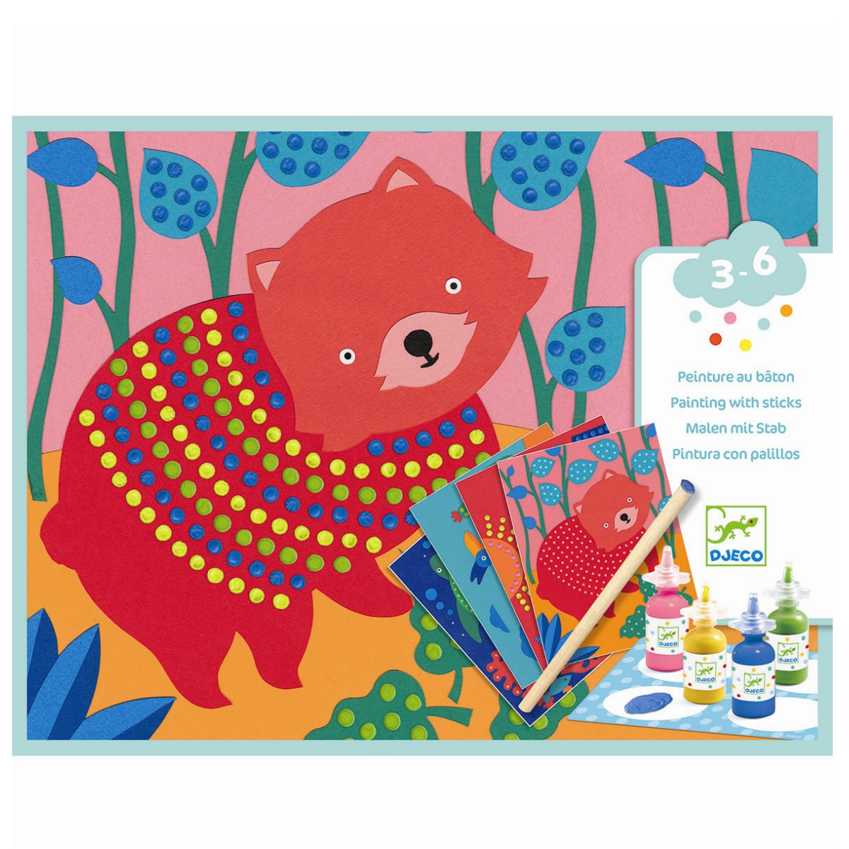 Dut dut duut. Med dette sęt kan dit barn pynte fine dyrebilleder med dutter af maling. Ęsken indeholder:4 pinde til at dutte maling på billederne4 x maling i guld, lyserųd, blå og grųnMaleunderlag og palette at hęlde farverne ud påDyrekort til at dutte malingen på.En nem måde at vęre kreativ og lave noget fint, så det fųrer til succesoplevelser for dit barn og ųget selvtillid i forhold til at male og kreere.Samtidig lęrer dit barn om farvegenkendelse og årsag-virkning, når malingen fx skal tųrre inden I flytter billederne.