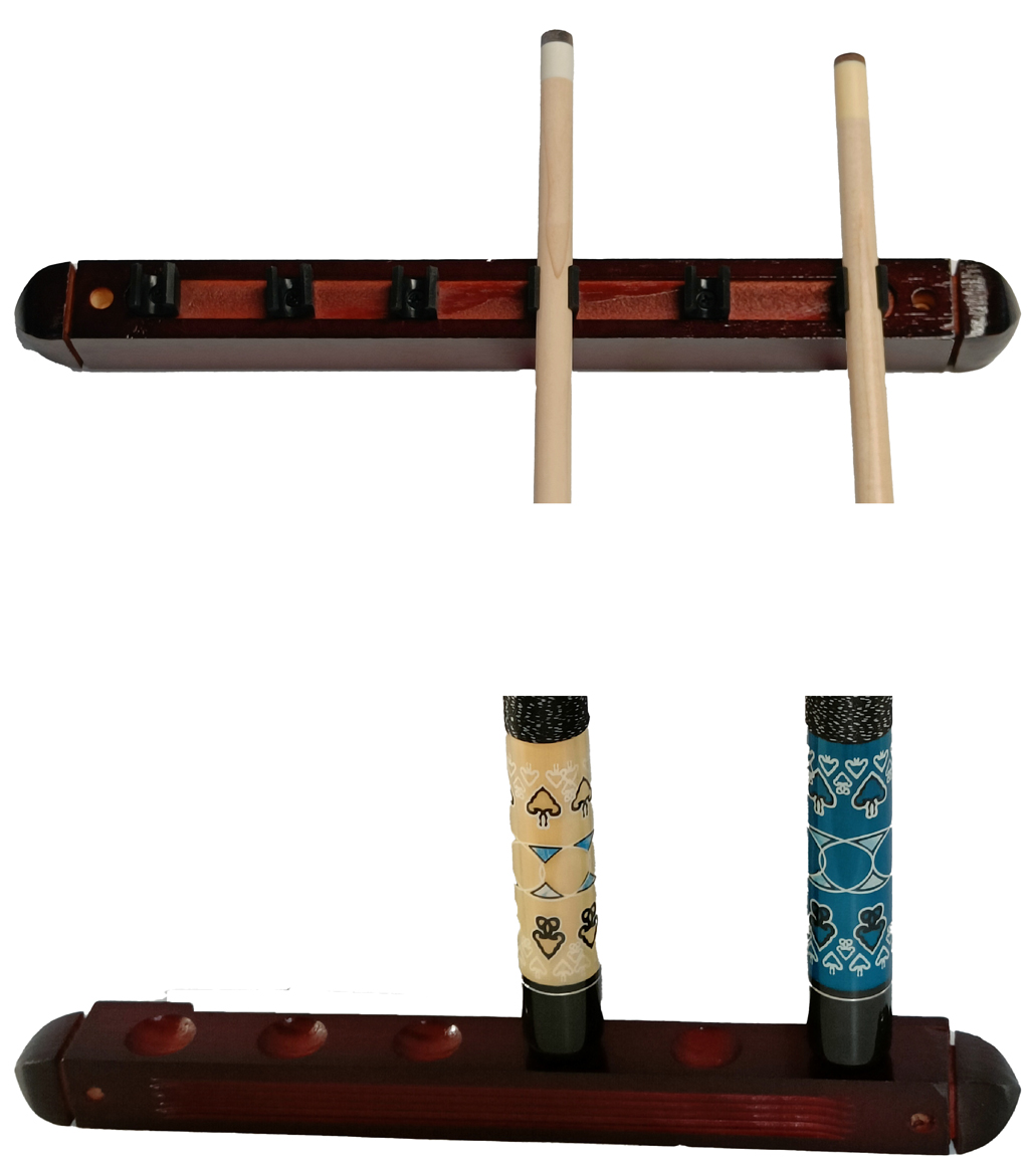 Køholder til 6 poolkøer med chips i overdelen. Stativet optager minimalt med plads, samt nem montering. Farve: mørk mahogni farve Montering: på væggen. Størrelse: 39 cm i bredden. Dybde overdel 4,5 cm og underdel 4 cm