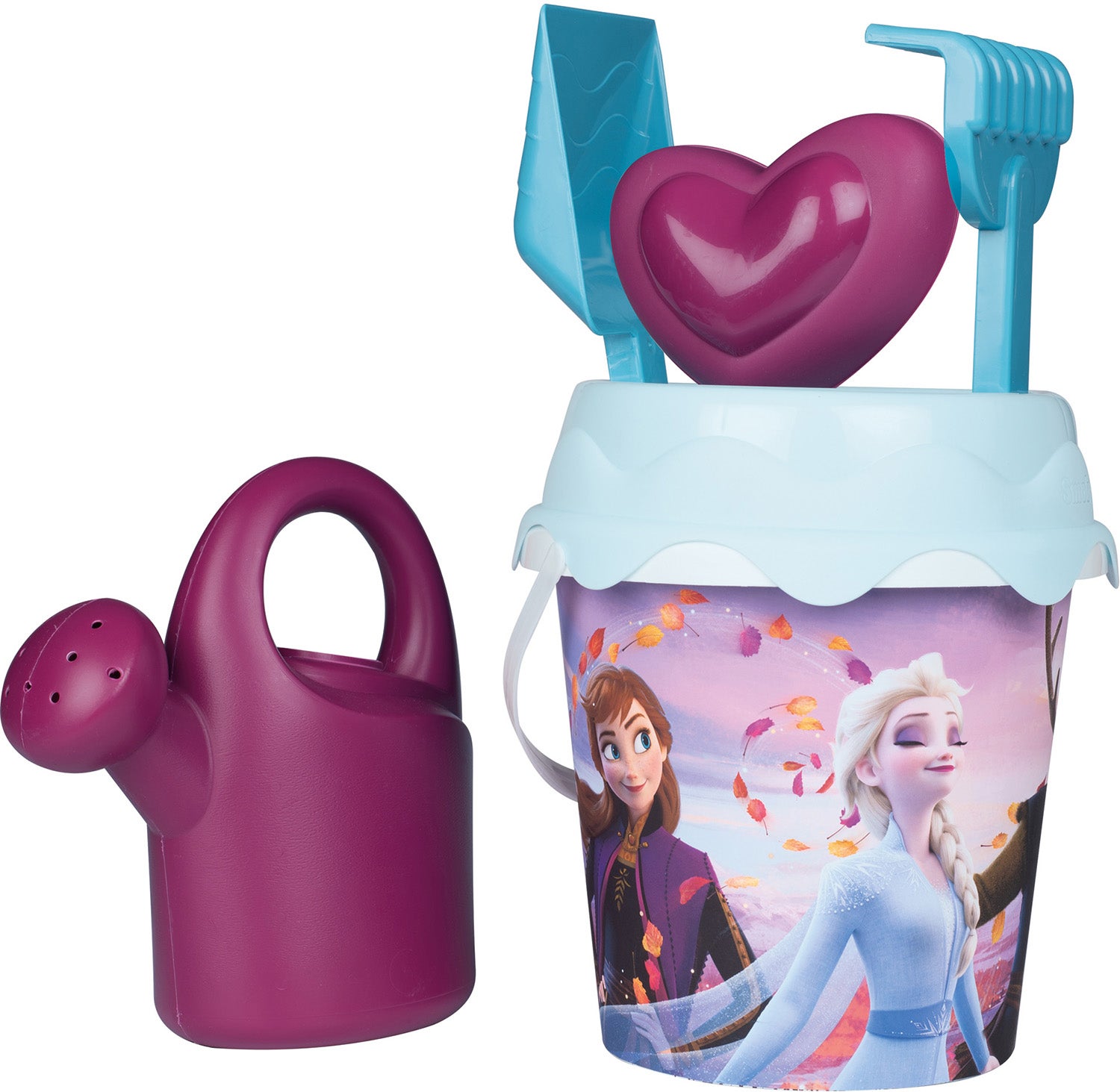Frozen sandlegetøj fra Smoby med en dekoreret spand med et håndtag. Der medfølger også en hjerteformet sandform, en rive, en vandkande, en si og en skovl. Perfekt til en dag på stranden eller leg i sandkassen. CE-mærket Anbefalet alder: Fra 1.5 år 100 % plastik