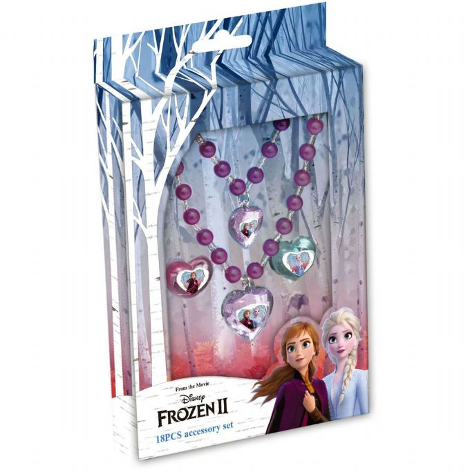 Rigtig fine smykker med motiv af søstrene Anna og Elsa fra Disney filmene Frost. I æsken medfølger der er et perlearmbånd, en perlehalskæde og to ringe.