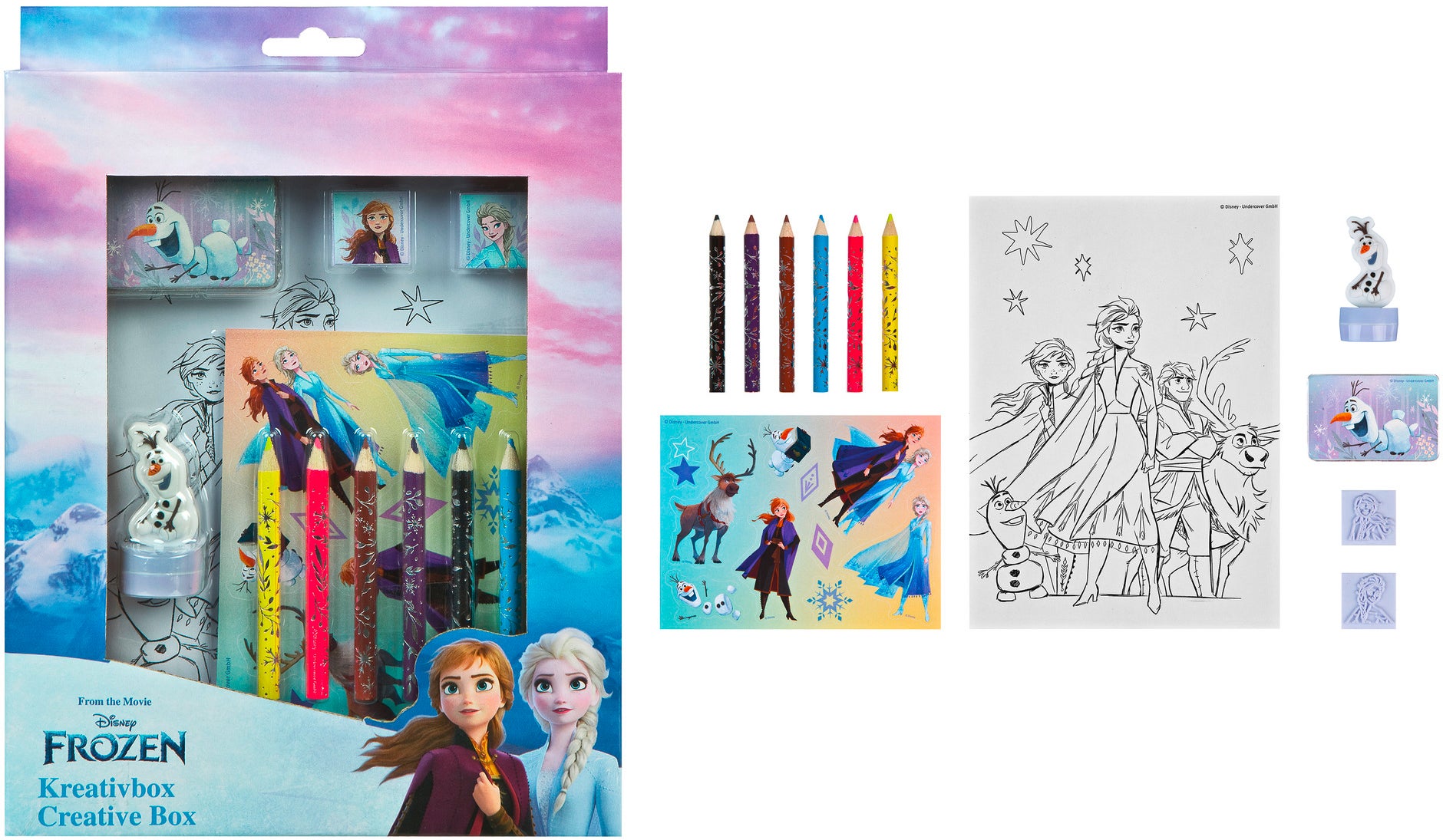 Kreasæt fra Disney Frozen med en masse sjovt tilbehør til maling og håndværk. Perfekt til kreative aktiviteter. - Indeholder: 6 farveblyanter, 2 stempler, 1 3D-stempel, 1 stempelpude, 10 farvelægningsbilleder, 1 klistermærkeark. - Farvelægningsbillederne har A5-format. - Motiv fra Disney Frozen. - Til masser af sjov kreativitet. - CE-mærket. - Anbefalet alder: Fra 3 år. - Plastik.