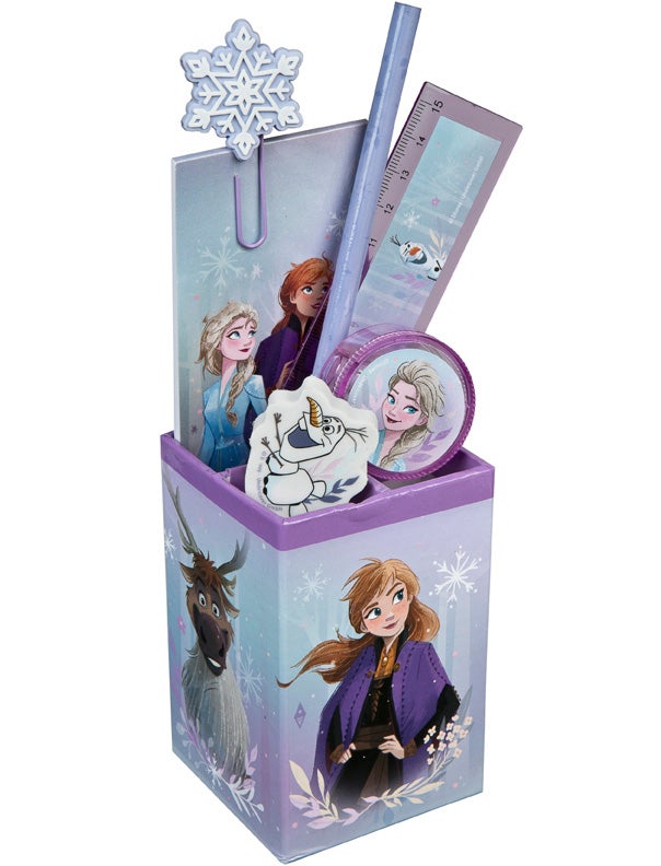 Penneholder fra Disney Frozen fyldt med alt det, du har brug for til at tegne og skrive i skolen og derhjemme. - Indeholder: 1 blyant, 1 viskelæder, 1 lineal, 1 blyantspidser, 1 lille blok, 1 papirclips. - Blyantholder: 20 x 8 x 5 cm. - Motiv fra Disney Frozen. - Til masser af sjov kreativitet. - CE-mærket. - Anbefalet alder: Fra 3 år.
