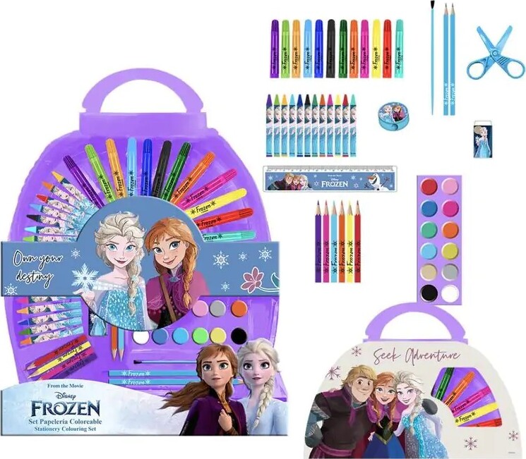 Kufferten er pyntet med de populære Disney Frost-figurer, Elsa og Anna, og indeholder hele 50 forskellige dele, så dit barn har alt, hvad der skal bruges til at udfolde fantasien gennem tegning, maling og farvelægning.