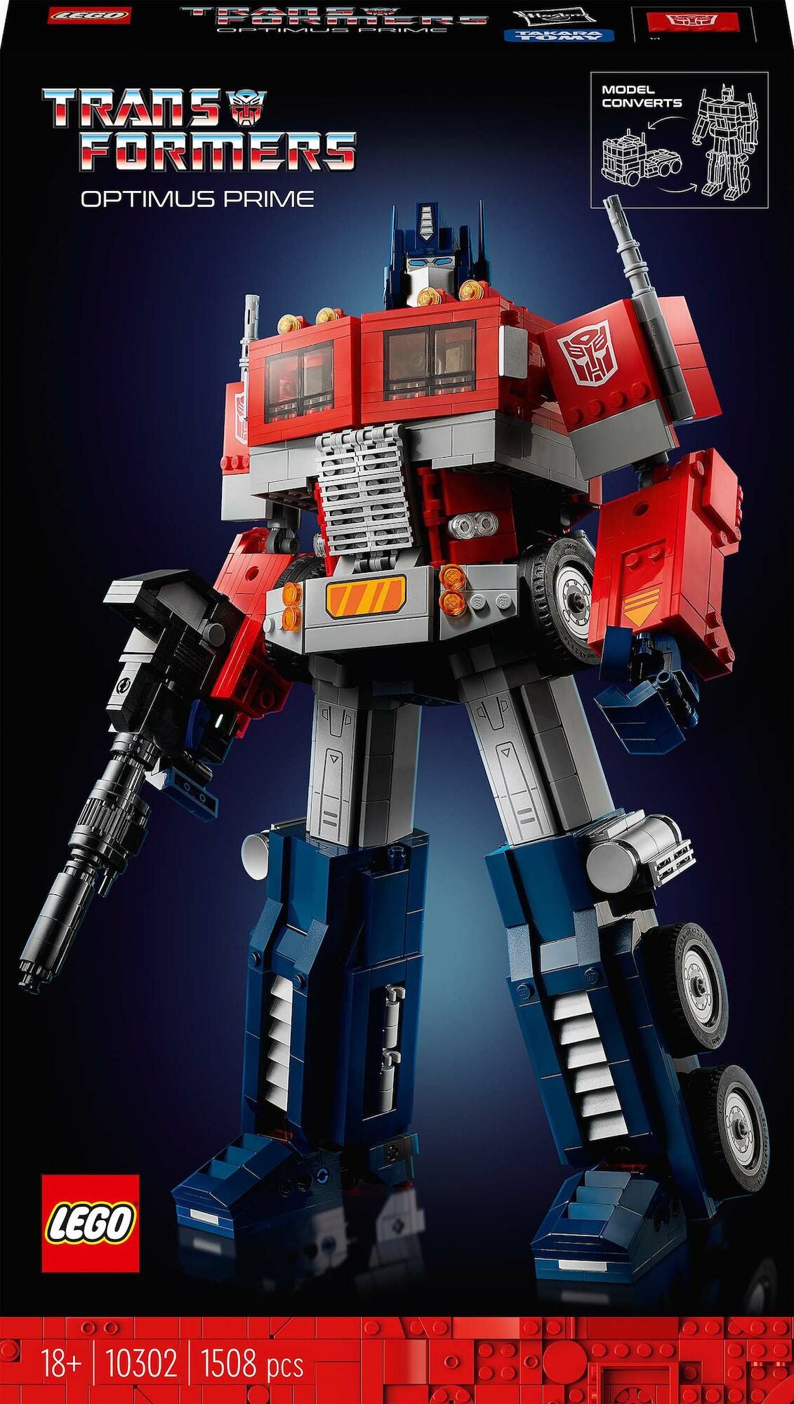 Optimus Prime. De heltemodige autobotters leder. Og nu en imponerende LEGO® 2-i-1-model til Transformers-fans. Genfind din passion for Transformers-universet med dette berigende byggeprojekt for voksne, når du skaber alle detaljerne ved en ikonisk robot. Skjult frit fremme Præcis som den elskede original kan denne Optimus Prime-model omdannes fra en robot til en lastbil og tilbage igen. Nyd modellens 19 bevægelige led i robottilstand, og åbn brystkammeret for at opbevare autobotternes ledermatrix. Fastgør jetpacken i robottilstand, og sæt ionblasteren og Energon-øksen i autobottens hænder. Andet autentisk tilbehør omfatter en Energon-terning og midterpanel valgfrit. Sæt pladen på for at vise din passion for Transformers. Velkommen til din helt egen verden Tilbring kvalitetstid med LEGO byggesæt af højeste kvalitet for voksne. Dette sæt kan være et fordybende projekt for dig selv eller en perfekt gave til enhver, der elsker samlerobjekter med Transformers-tema. Byg en detaljeret LEGO® 2-i-1-samlermodel af Optimus Prime Modellen kan omdannes fra en autobot til en lastbil og tilbage igen Indeholder masser af autentisk tilbehør En gave til Transformers-fans, designet specielt til voksne Omfatter en udstillingsplade, så du kan udstille din passion Robotten har 19 bevægelige led I robottilstand er modellen over 35 cm høj Indgår i et sortiment af LEGO® sæt, der er designet til voksne byggefans LEGO® klodser passer perfekt sammen og er nemme at skille ad hver gang LEGO® komponenter lever op til høje sikkerheds- og kvalitetsstandarder