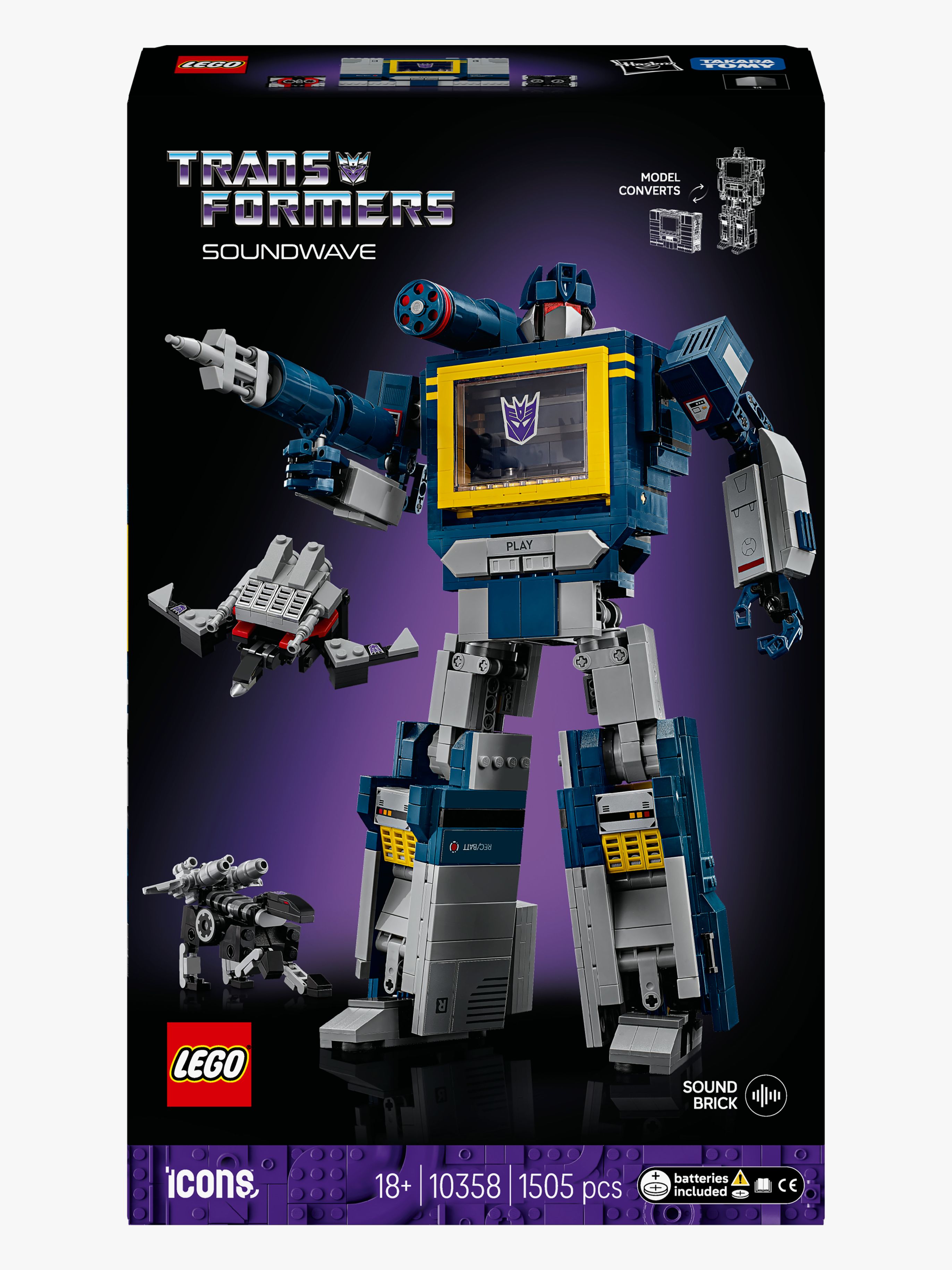 Byg en imponerende udstillingsmodel, eller overrask én, du holder af, med LEGO Icons byggesættet Transformers: Soundwave 10358, et sæt til hjemmet eller kontoret, designet til voksne og fans af den episke sci-fi-filmserie. Byg en detaljeret LEGO actionfigur af den ikoniske decepticon-robot og hans trofaste følgesvende Ravage og Laserbeak. Tryk på Soundwaves afspilningsknap for at aktivere optagne stemme- og lydeffekter. Figuren omfatter raketkapsel, laserblaster og pile som tilbehør, har bevægelige led og kan nemt konverteres til kassetteafspiller-tilstand og tilbage uden at skulle skilles ad. Figurerne af Ravage og Laserbeak kan omdannes til modeller af kassettebånd, der passer ind i Soundwaves kassetteåbning. Sættet omfatter også en faktaplade med data om Soundwave. LEGO Builder appen indeholder en 3D-version af byggevejledningen, der følger med dette sæt. Udforsk en mulighed for afslapning med det inspirerende sortiment af LEGO byggesæt til voksne. Indeholder 1.505 elementer. LEGO Icons Transformers: Soundwave modelbyggesæt til voksne og filmfans Indeholder bevægelige figurer af Soundwave, Ravage og Laserbeak samt tilbehør Tryk på Soundwaves afspilningsknap for at aktivere stemme- og lydeffekter Opstil robotterne, eller fang dem midt i omdannelsen i en flot udstilling hjemme eller på kontoret En perfekt julegave eller fødselsdagsgave til fans af den episke science-fiction-filmserie LEGO Builder appen indeholder en 3D-version af byggevejledningen Se det store sortiment af LEGO Icons byggesæt til voksne Figuren af Soundwave i samlesættet med 1.505 elementer er over 33 cm høj