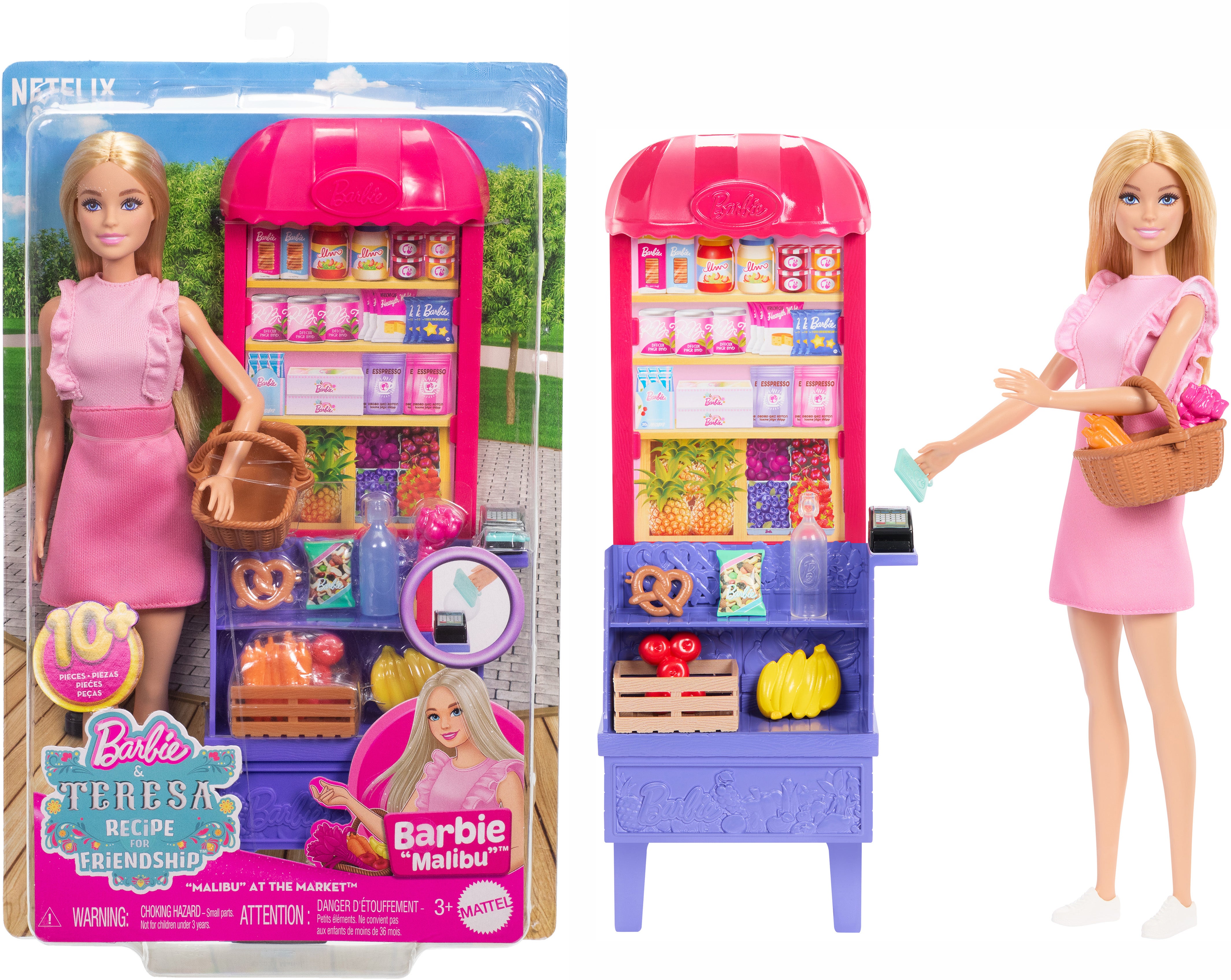 Legesæt fra Barbie med en medfølgende dukke. Det har en markedsbod med forskellige madvarer og tilbehør. Perfekt til timevis af fantasifuld leg. - Indeholder: 1 barbiedukke, 1 markedsbod, 1 indkøbskurv, 1 opbevaringskurv, 1 kortlæser med et betalingskort, 7 madvarer. - Til sjov og fantasifuld rolleleg. - Kendt fra Netflix-serien Barbie & Teresa. - CE-mærket. - Anbefalet alder: Fra 3 år. - Plastik.