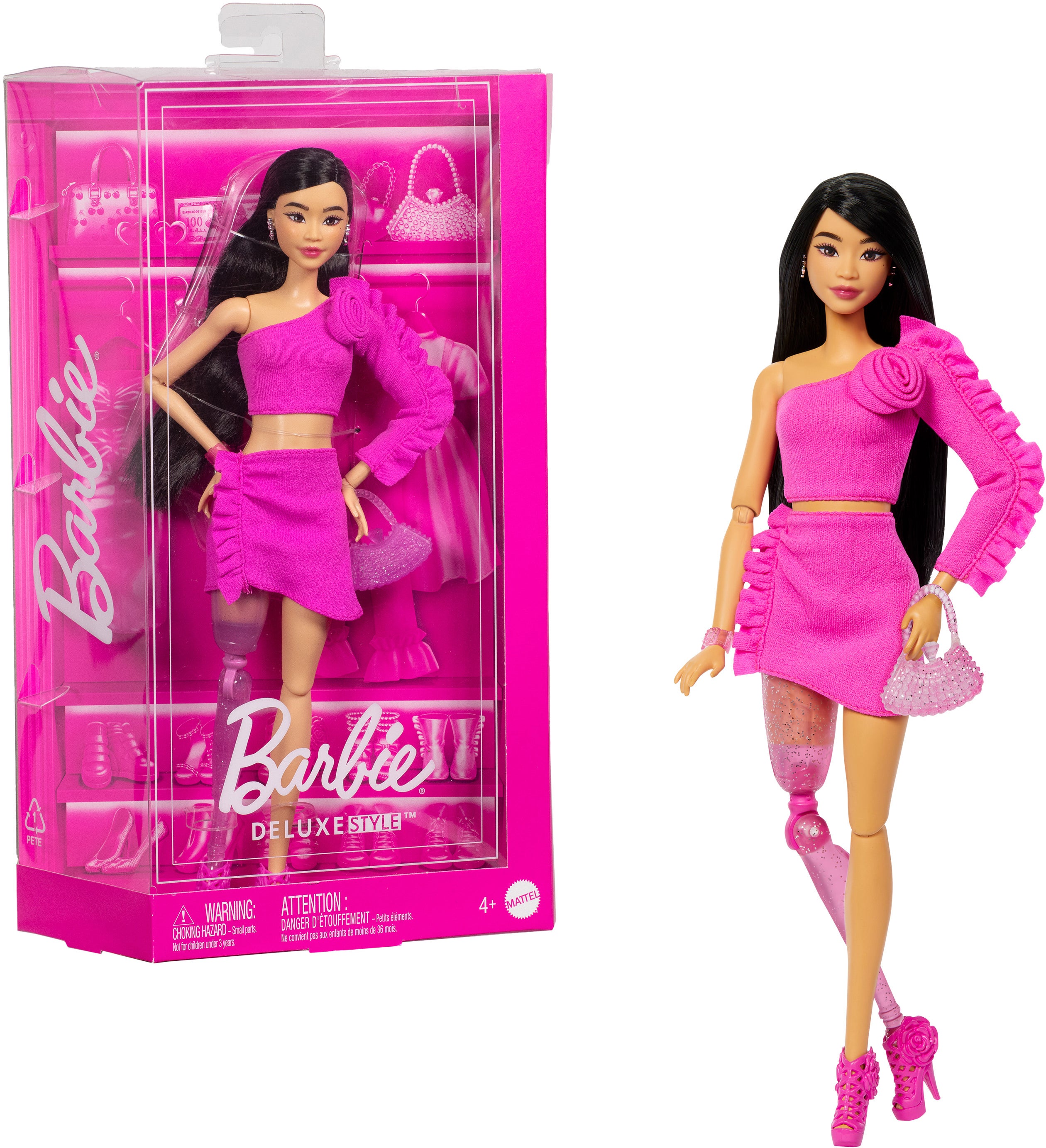 Dukke fra Barbie med langt, sort hår. Den har et stilfuldt outfit og en glitrende benprotese. Dukken har en masse sjovt tilbehør i en pæn lyserød farve. Perfekt til timevis af fantasifuld leg. - Indeholder: 1 barbiedukke, 1 par solbriller, 1 håndtaske. - Aftageligt tøj. - Dukke, der kan posere. - Saml på alle produkterne i serien. - CE-mærket. - Anbefalet alder: Fra 4 år. - Plastik.
