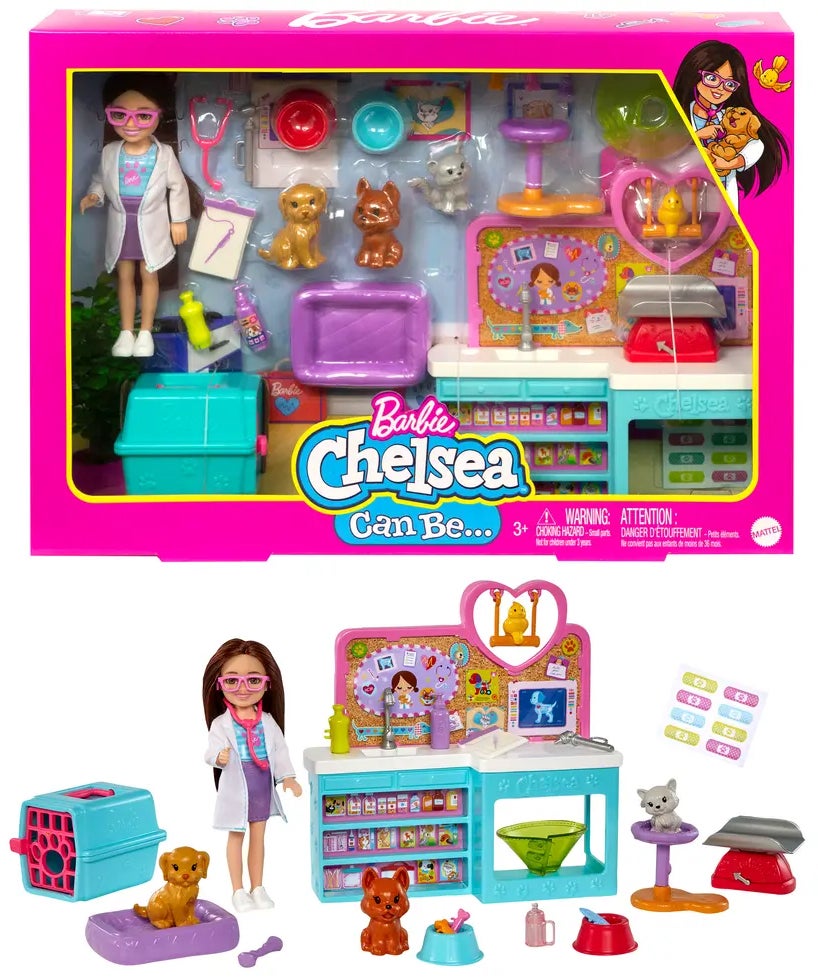 Legesæt fra Barbie med et sjovt, farverigt design. Det har en Barbie dukke der kan blive dyrlæge og kæledyr med en masser af tilbehør. CE-mærket. Uegnet for børn under 3 år på grund af små dele. Anbefalet alder: Fra 3 år.