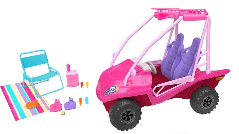 Fantasi kan føre til alle mulige strandhistorier med dette strandbuggy-legetøjssæt fra serien Barbie Mysteries: Stranddetektiver! Inspireret af den populære serie transporterer denne sporty strandbuggy små fans til stranden med sit pink ydre, tagbagagebær