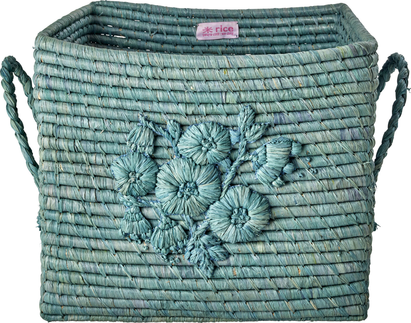 Rice - Raffia Square Basket With Flower Embroidery - Dove Blue