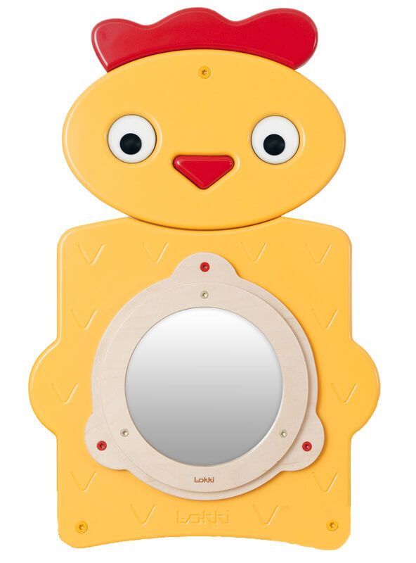 KykkeliKy - den søde kylling vil gerne snakke med dig! Med spejlet på maven er dette søde vægelement en sand børnemagnet. Børn elsker at se sig selv i spejlet - og det er en fin måde at udforske, hvordan ansigtsudtryk og mimik faktisk virker. Med legetøjet på væggen opnår I flere fordele både for børnenes motorik og for de voksne, der skal tage sig af at skabe udviklende miljøer for børnene i dagligdagen: 1:Legetøjet er altid ved hånden, og der skal ikke bruges personaleressourcer på at tage frem og pakke væk2: Der er altid motorisk stimulerende aktiviteter indenfor rækkevidde for børnene3: Der er ikke smådele, der kan blive væk, gå i stykker eller være til fare for de mindste børn. Det gør vægpaneler yderst velegnede til integrerede stuer i institutioner og til venteværelser, museer, biblioteker, færger o. lign.Fremstillet af birketræsfiner og MDF.Måler 36 x 55 cm.