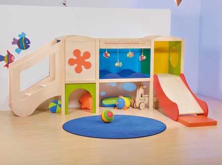 Flot indendørs legeplads med mange års skøn leg, der med garanti får fantasien og kroppen i gang hos børn mellem 1-5 år. To tårne med Akvarium og fisk, der kan flyttes. I bunden af akvariet er der 3 vinduer, børnene kan kigge ud ad. Den søde rutschebane og trappen med gelænder giver ekstra muligheder for motoriske udfordringer.Måler 233 x 130 x 66 cm - podiet er 59,9 cm høj.