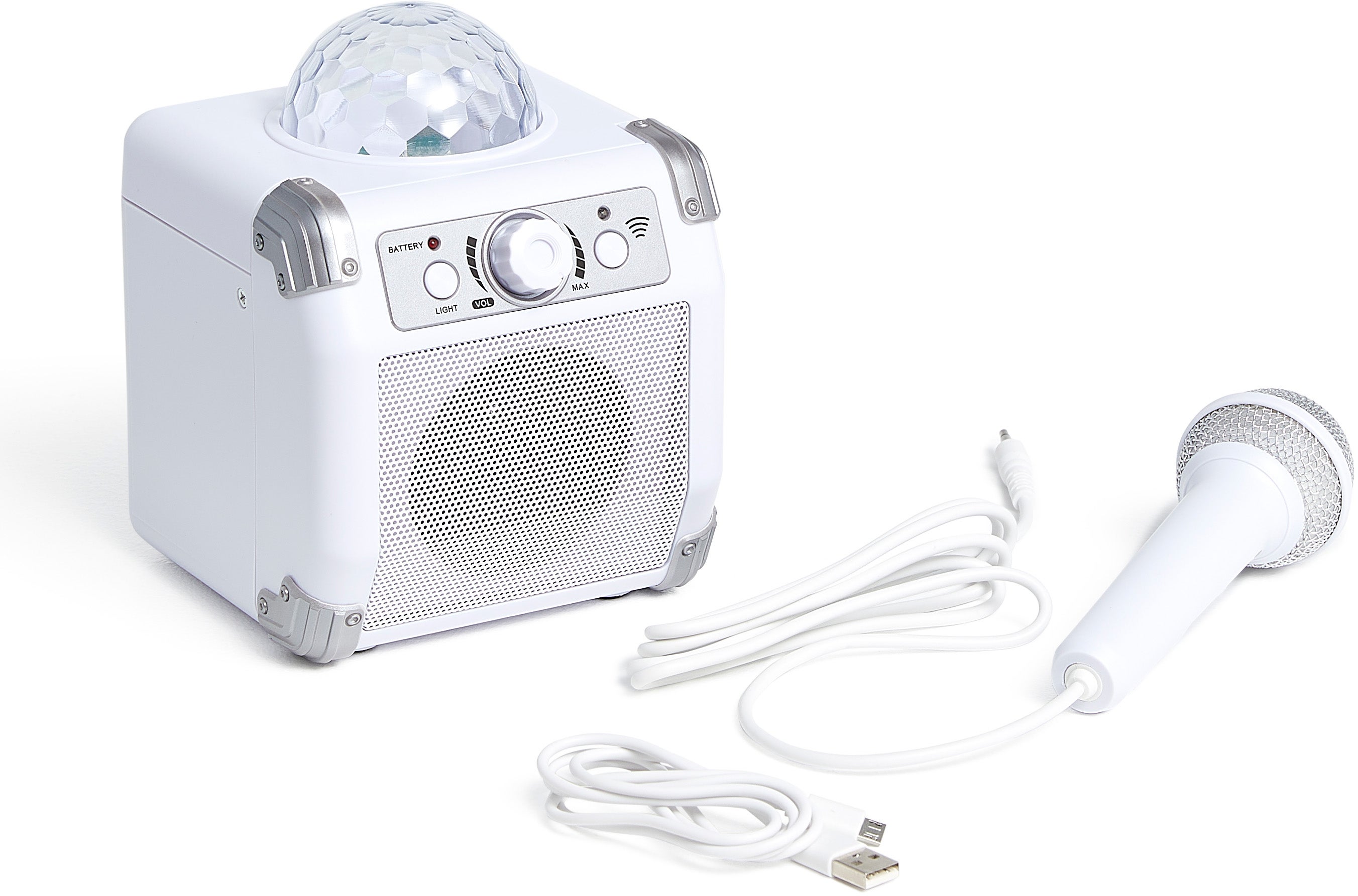 Byd på sang med denne sjove trådløse karaokemaskine med tilhørende mikrofon og diskokugle. Lydsystemet kan kobles direkte til IPhone- og Androidtelefoner. Diskokuglen snurrer rundt og spreder blinkende farver på væggene den blinker i takt med den sang, du har valgt. Karaokemaskinen lades op med hjælp af det medfølgende USB-kabel. Du kan skrue op og ned for lyden med rattet i midten. - Indeholder 1 karaokemaskine, 1 mikrofon, 1 USB-ledning. - Lys som blinker i takt med musiken. - Bluetooth. - CE-mærket. Anbefalet alder: Fra 4 år.