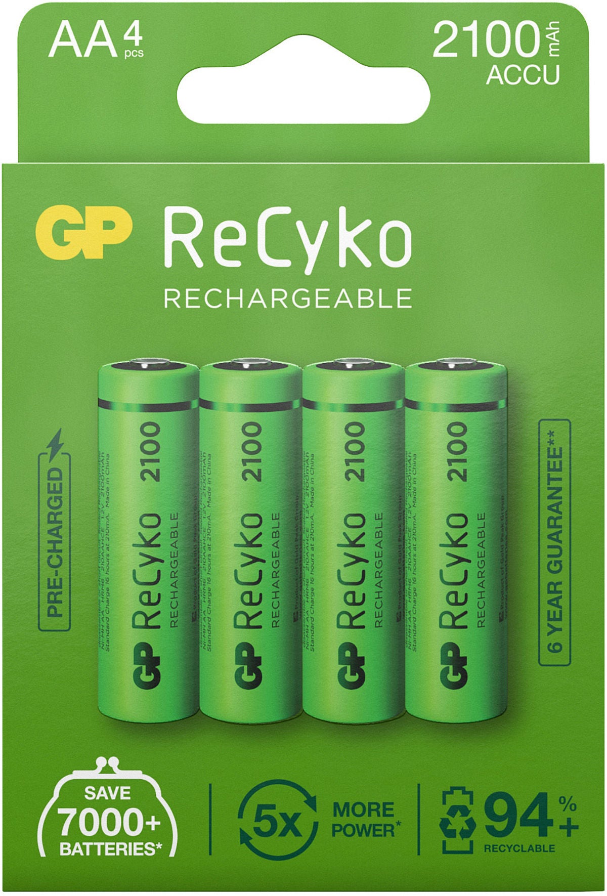 En pakke med 4 genopladelige batterier fra ReCyko. Batterierne er opladede og klar til brug, men kan genoplades hundredvis af gange. Batterierne har et lavet selvudslip og kan holde ladningen i op til et år, hvis de ikke bruges. GP Recyko er et godt valg for både dig og miljøet! - Batteritype: NIMH ReCyko - Kapacitet (mAh): 2100 - Spænding (Volt): 1.2 V