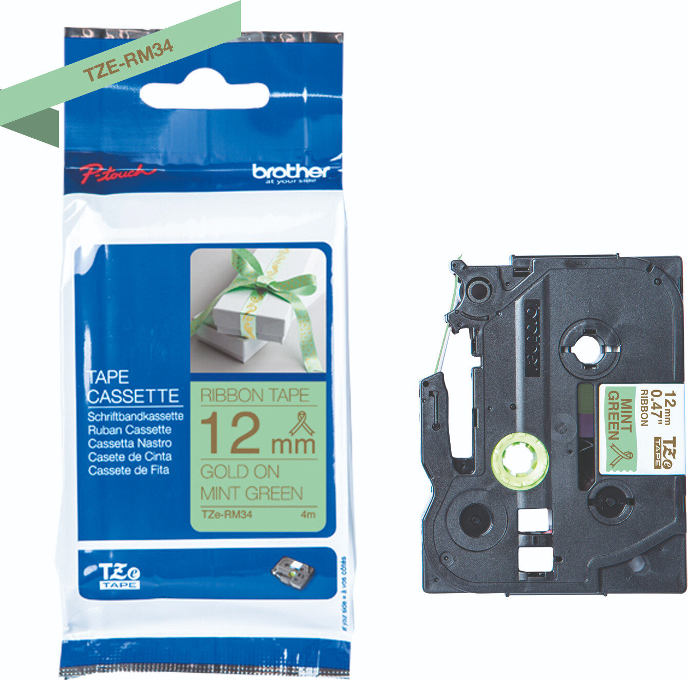 Brothers originale TZe-RM34 satinbånd af høj kvalitet i guld på mintgrøn. Med Brothers originale...