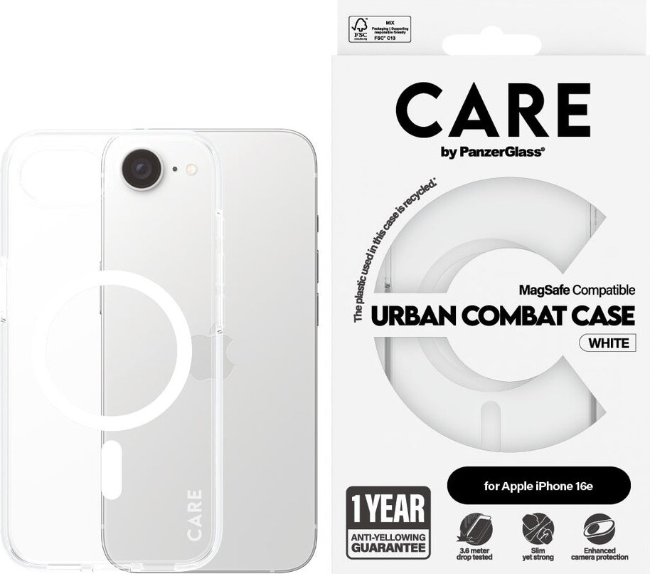 Dette transparente Care by PanzerGlass cover med MagSafe er skabt til iPhone 16e og forener diskret...