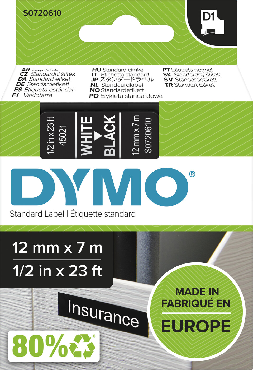 Dymo - D1 Tape - 12 Mm - 7 M - Hvid På Sort