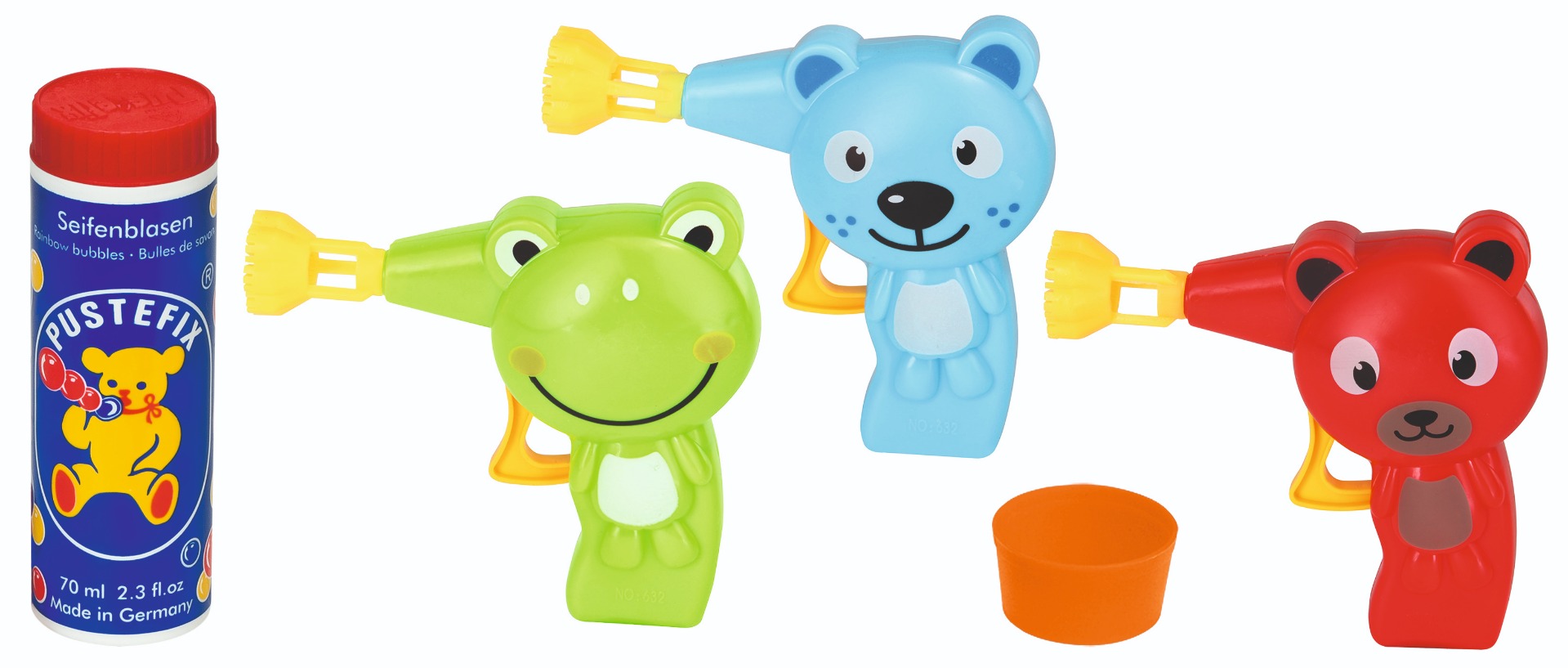 Helt simpel sæbeboblepistol, som dit barn hurtigt selv kan håndtere. Hæld lidt sæbeboblevæske op i den lille beholder, dyb spidsen af pistolen, og skyd herefter med bobler.Obs: Farven på sæbeboblepistolen bliver en overraskelse - de leveres nemlig assorteret.Her er 70 ml sæbeboblevæske.Lad ikke din skepsis stikke af med dig over de kække farver og det anderledes navn på mærkaten. Her er tale om det bedst kendte brand indenfor sæbebobler i Tyskland, hvor Pustefix med bamsen i blå/gul/rød print har eksisteret siden 1948.Så velkommen til Pustefix - vi håber, at I vil tage godt imod.Sæbebobler kan indgå i udviklende leg på mange måder. Det er fascinerende at se boblerne forme sig og pludselig slippe, svæve for til sidst at poppe og forsvinde lige så hurtigt, som de kom.Helt små babyer elsker at se på sæbebobler. Læg dit barn på ryggen eller maven og blæs sæbebobler - prøv at se, om dit barn kan følge dem på øjnene. Lidt større børn kan krybe eller kravle efter sæbeboblerne.Om vinteren i hård frost kan du måske have held med at fryse sæbeboblerne - det er et smukt syn.Du kan også finde inspiration til at være kreativ med sæbebobler rundt om på internettet.God fornøjelse.