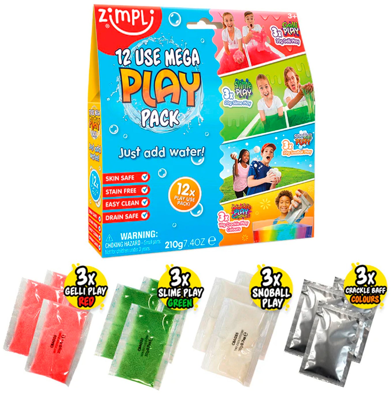 Sjovt legesæt fra Zimpli Kids med fire spændende produkter til dit barn at udforske. Perfekt til kreative aktiviteter. - 12-pak. - Indeholder Gelli, Slime, Snoball, Crackle Baff med forskellige teksturer og egenskaber. - Man skal bare tilsætte vand. - Kun fantasien sætter grænserne. - Indeholder 12x20 g pulver. - Certificeret biologisk nedbrydeligt. - God mod huden. - Efterlader ikke pletter. - CE-mærket. - Anbefalet alder: Fra 3 år. - , plastik.