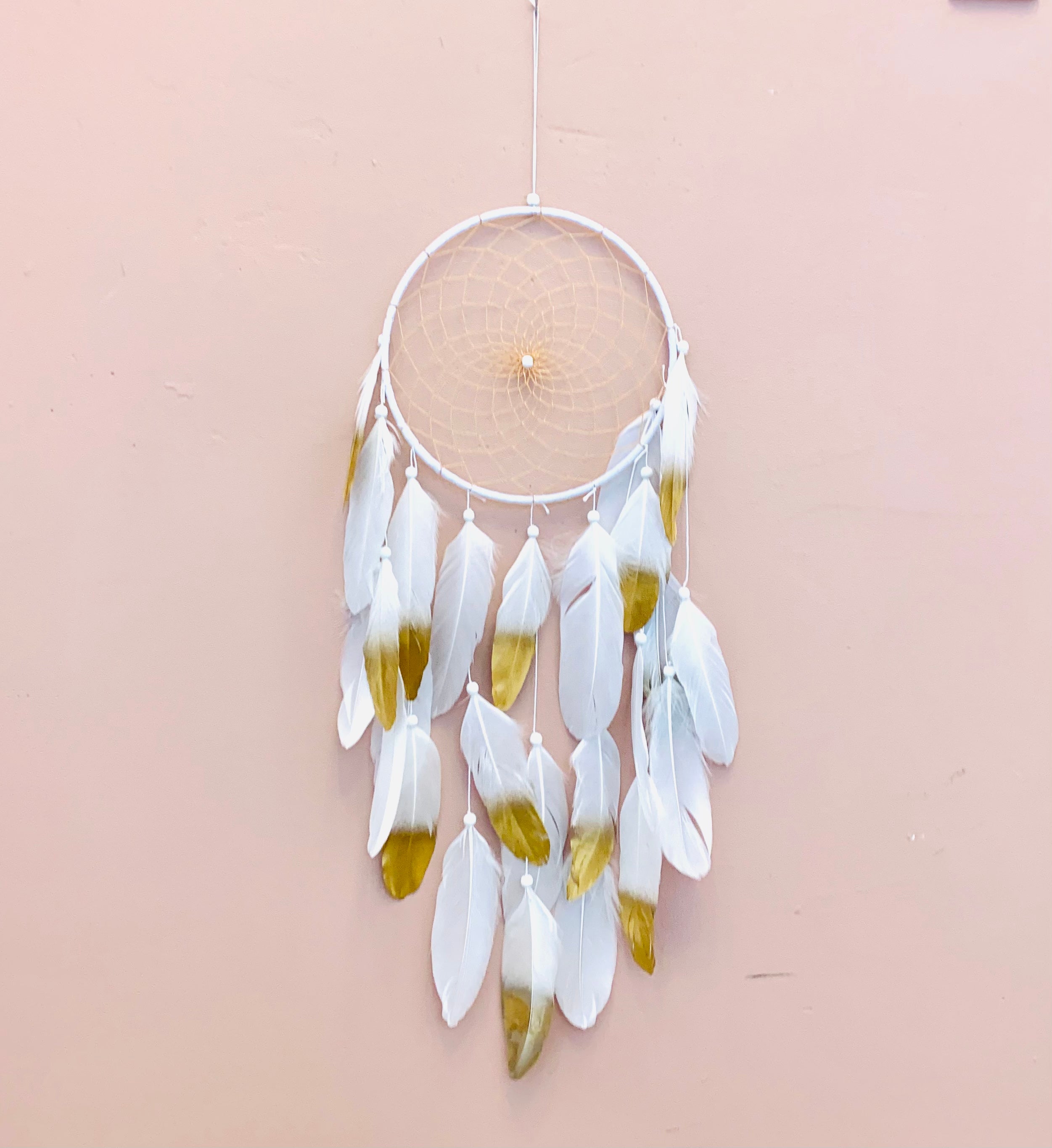 Drømmefanger Hvid Guld I MillaVanilla Indret din bolig eller børneværelse med vores smukke drømmefanger i hvid og guld fra MillaVanilla. Denne drømmefanger skaber en helt speciel stemning i rummet med sit florlette udtryk og rolige energier. Den er