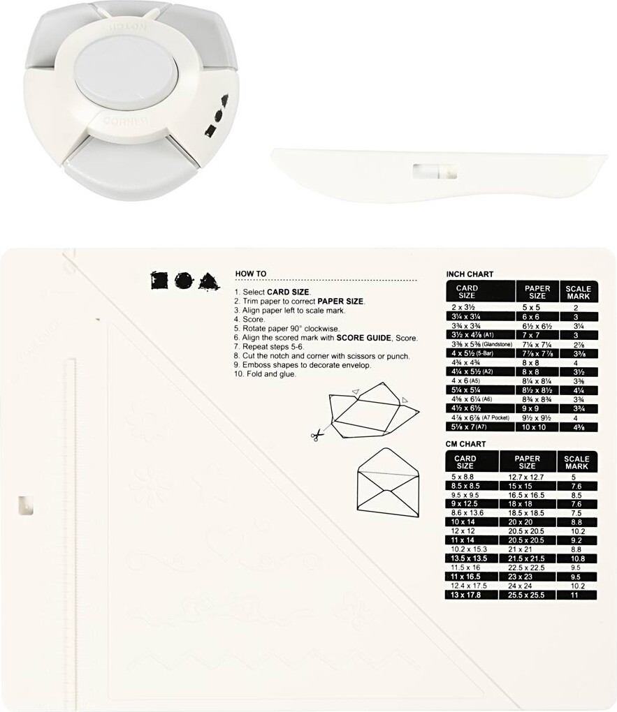 Praktisk værktøj i plast med påtrykte hjælpelinjer til let og præcist foldning af kort og...