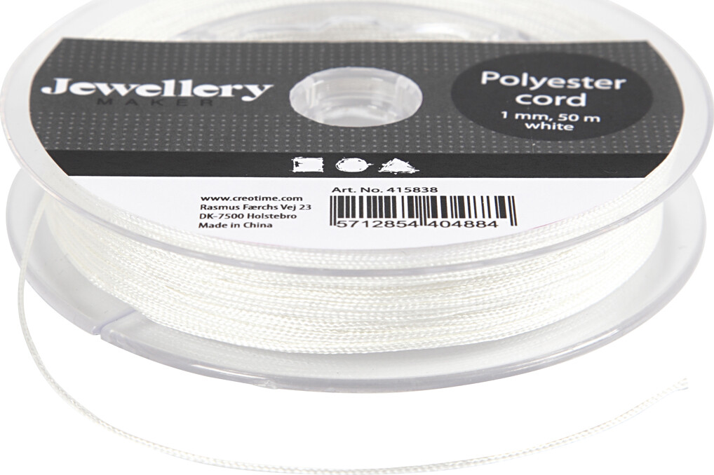 Polyestersnoren er en hvid blank snor af flot kvalitet, som er 1 mm tyk og har en længde på 50...