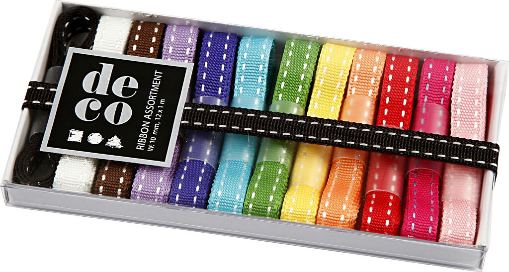 Dette sortiment af dekorationsbånd indeholder 12 farver af vævet bånd af høj kvalitet, hver med...
