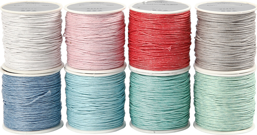 Dette assorterede sæt af bomuldssnor indeholder otte farver af vokset bomuldssnor med en tykkelse...
