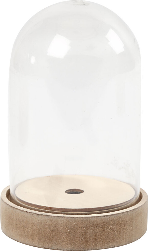 Rund klokke af klar plast med løs fod og topplade af MDF. Anvendes til lille udstilling af diverse...