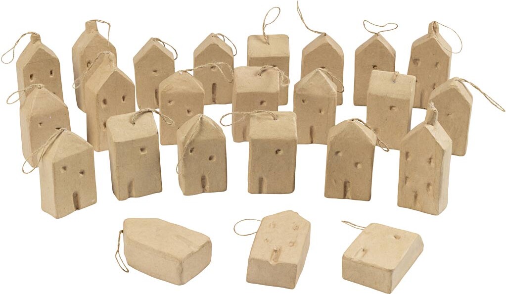Dette sæt med 24 håndlavede huse af papmaché er perfekt til dekorative formål eller som...