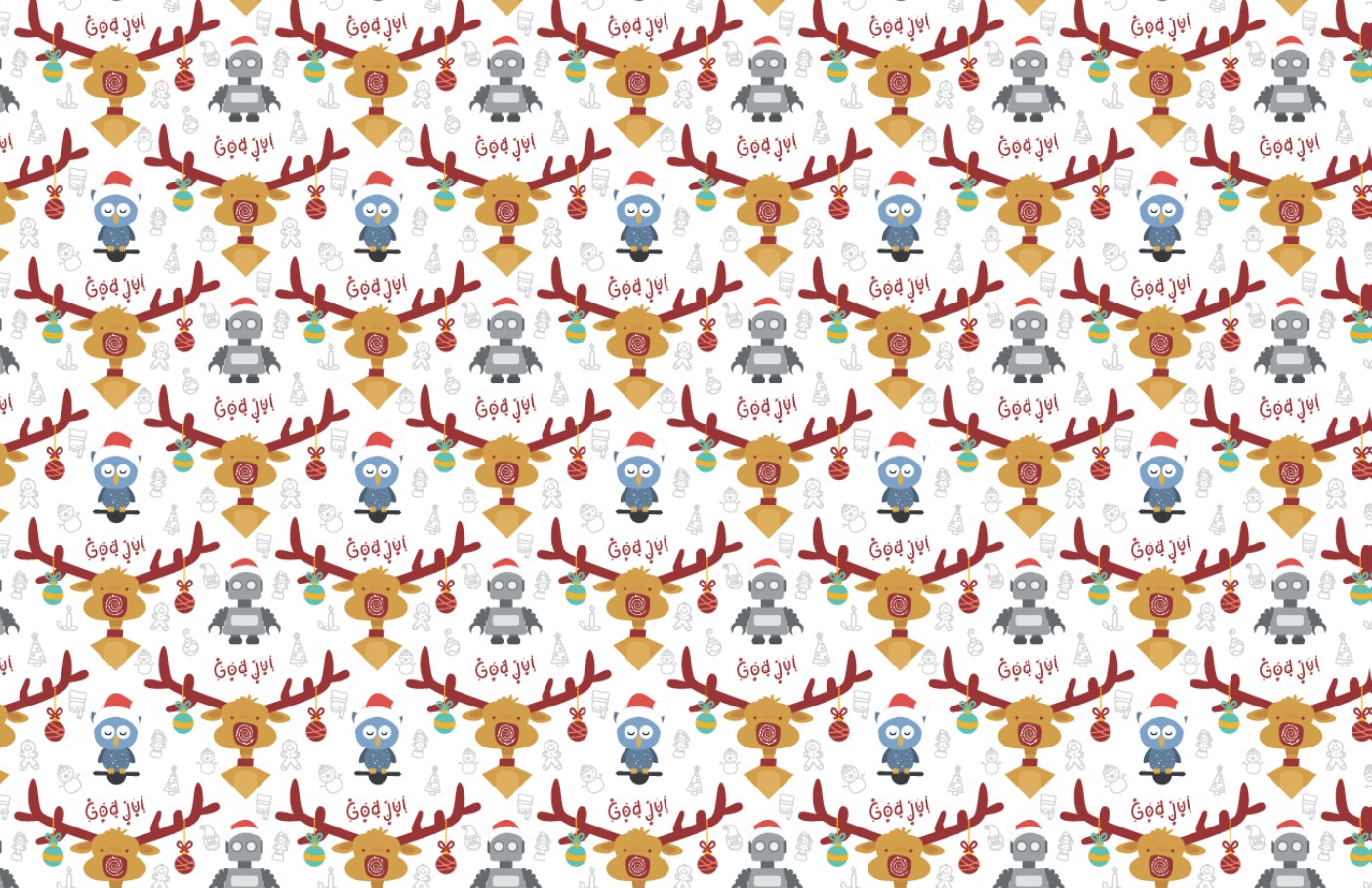 Julegavepapir med teksten God jul og søde julemotiver. Rensdyr med julekugler og både robot og ugle har fået nissehue påRullen måler 40 cm i bredden, og der er 3 meter gavepapir i rullen.