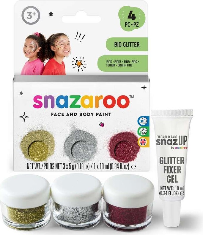 Snazaroo Ansigtsmaling - Glitter i farverne guld, sølv, og rød er den perfekte tilføjelse til enhver fest eller begivenhed. Denne ansigtsmaling kommer i praktiske 3x5 g pakker, hvilket gør det nemt at anvende og opbevare. Uanset om det er til børnefødselsdage, karnevaler, eller temafester, vil denne ansigtsmaling med glitter helt sikkert tiltrække opmærksomhed og skabe glæde. Produktene er vandbaserede, hvilket betyder, at de er lette at påføre og også nemme at vaske af efter brug. Med Snazaroo kan du skabe fantastiske designs og ansigtstræk, der vil imponere både børn og voksne. Den glitrende effekt tilføjer et ekstra touch af festlighed og glamour, hvilket gør det til et hit blandt alle deltagere. Sikkerheden er også i fokus, da ansigtsmalingen er dermatologisk testet og fri for skadelige stoffer, hvilket gør den velegnet til selv de mest sarte hudtyper. Uanset om du vil male ansigtet, hænderne eller andre dele af kroppen, giver Snazaroo Ansigtsmaling dig mulighed for at slippe din kreativitet løs. Lad dig inspirere af de mange muligheder, og skab uforglemmelige minder med denne fantastiske glitter ansigtsmaling.