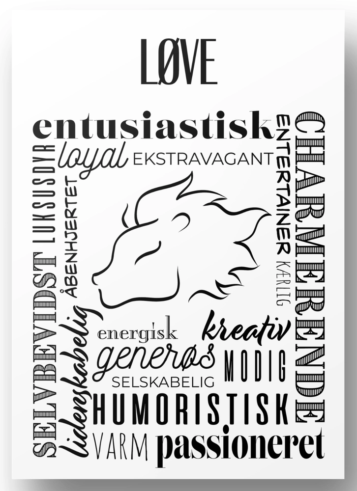 Tilføj et strejf af elegance og personlighed til dit hjem med vores håndtegnede plakat af en løve, der prydes med et inspirerende stjernetegns citat. Denne A4 plakat er ikke kun et kunstværk, men også en kilde til motivation og refleksion. Løven symboliserer styrke, mod og lederskab, hvilket gør den til den perfekte udsmykning for både stuer, kontorer og kreative rum. Plakaten er trykt på højkvalitets papir, der sikrer, at de detaljerede linjer og de flotte nuancer fremhæves perfekt. Den håndtegnede stil giver et unikt præg, der skiller sig ud fra masseproduktionen. Uanset om du er en stjernetegnsentusiast eller blot elsker dyreportrætter, vil denne plakat være et fantastisk valg til din indretning. Giv den som gave til en ven eller familie, der holder af astrologi eller kunst, eller forkæl dig selv med en plakat, der inspirerer dig hver dag. Sæt den i en ramme, hæng den op på væggen, og lad den blive et samtaleemne i dit hjem. Med denne plakat får du ikke kun et smukt kunstværk, men også en daglig påmindelse om de kvaliteter, som løven repræsenterer.