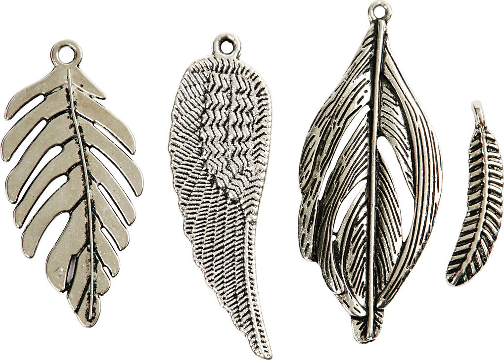 Fjer - Str. 29-55 Mm - Hulstr. 12-20 Mm - Antik Sølv - 4 Stk.