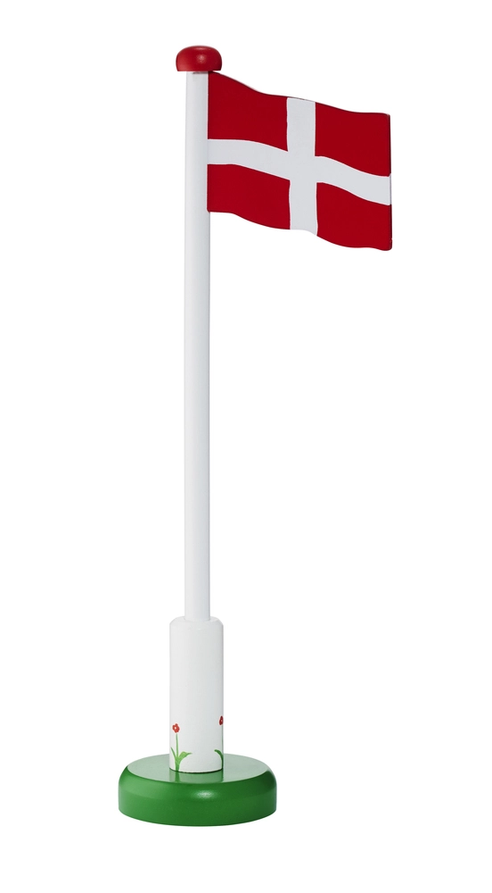 Fint og klassisk dannebrog flag i trę. Flaget står på en grųn fod som forestiller dejligt dansk gręs og op ad flagstangens fod er der 3 små fine blomster malet på. Mål: H: 36 cm.